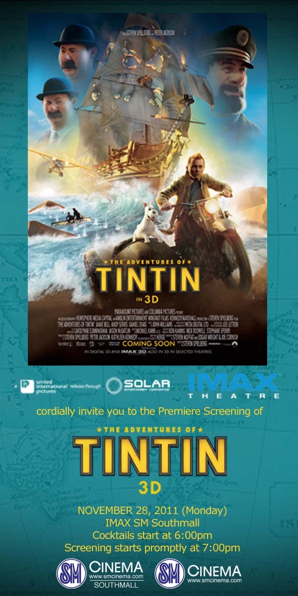 SM Cinema is happy to give away 10 premier tickets to lucky Alabang Bulletin readers for “The Adventures of Tintin” on 3D for tomorrow, Nov. 28, 6pm at the SM Southmall IMAX theater.
