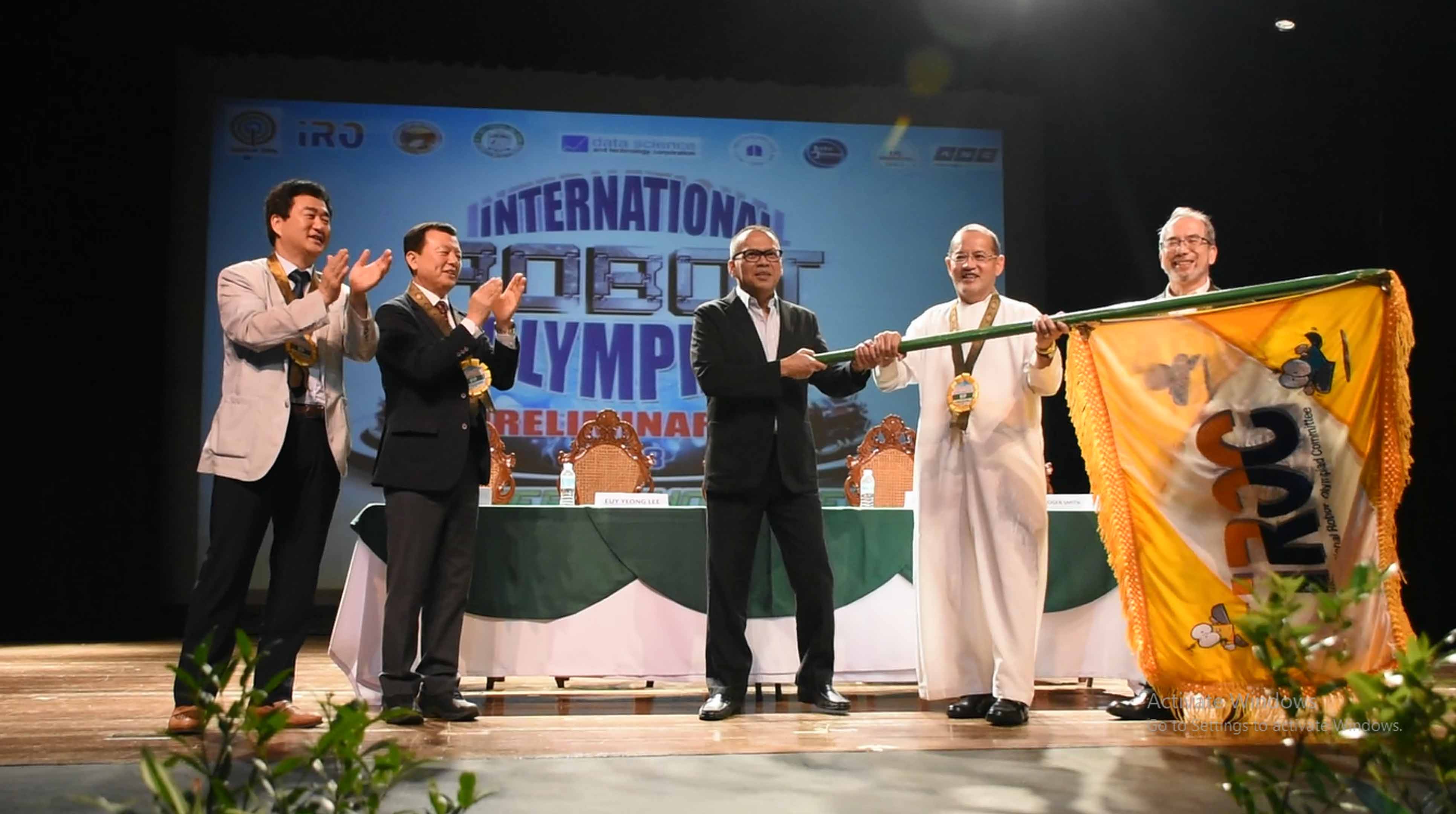 Muntinlupa Deputy Administrator (center) joins De La Salle Santiago Zobel President Br. Bernard S. Oca FSC (fourth from left) in waving the International Robot Olympiad Committee (IROC) Flag signaling the start of the 20th International Robot Olympiad last June 16 at DLSZ, CPA Theater, Ayala Alabang, Muntinlupa City. IROC expects 1,200 students from its 38 member countries will take part in this year’s robotics competition. Also shown in the photo are: IRO exec Euy Yeoung Lee, IRO Secretary General Young Soo Park, and Philippine Robotics Team and Data Science and Technology Corporation president Anthony Gabitan.