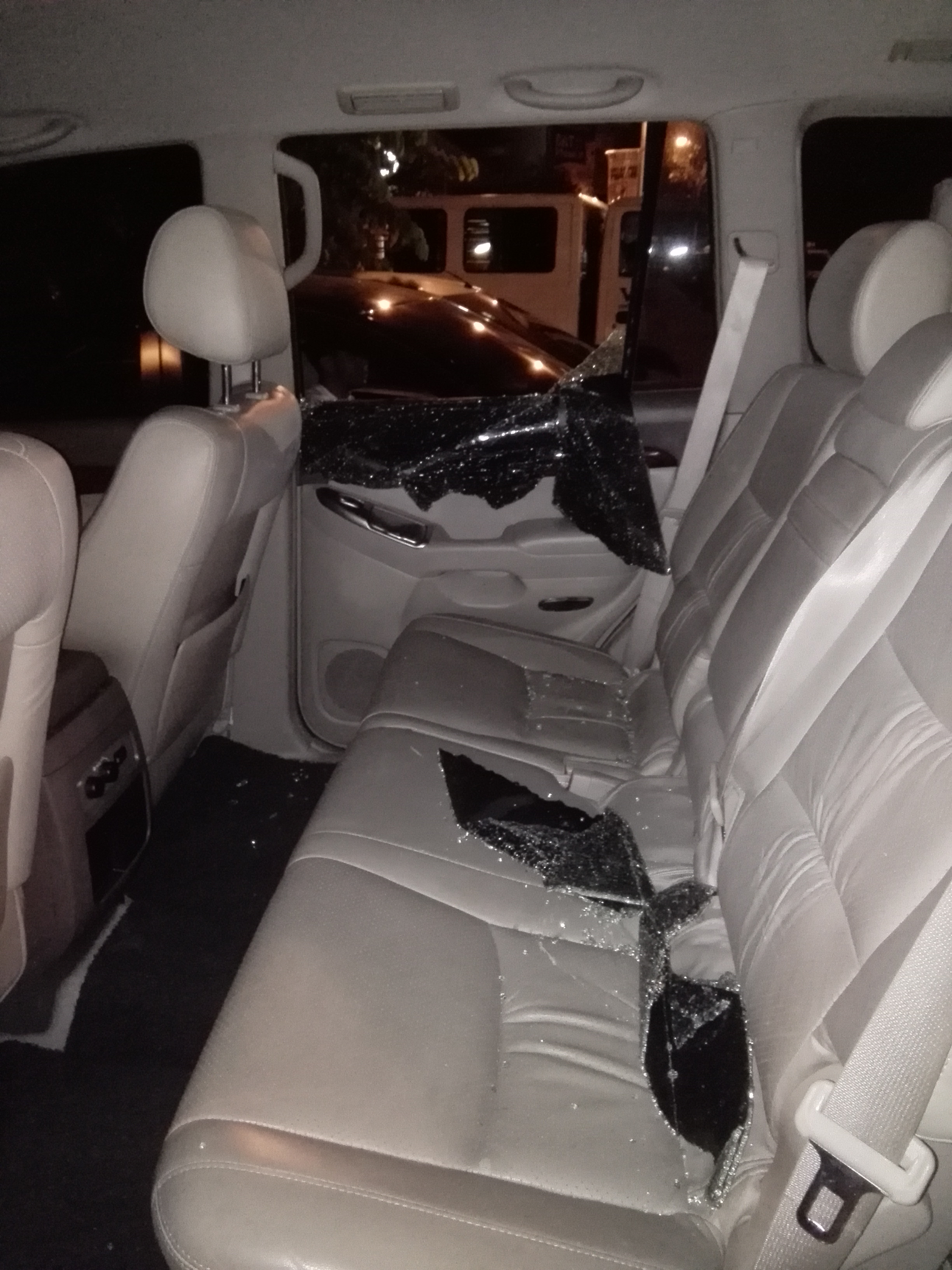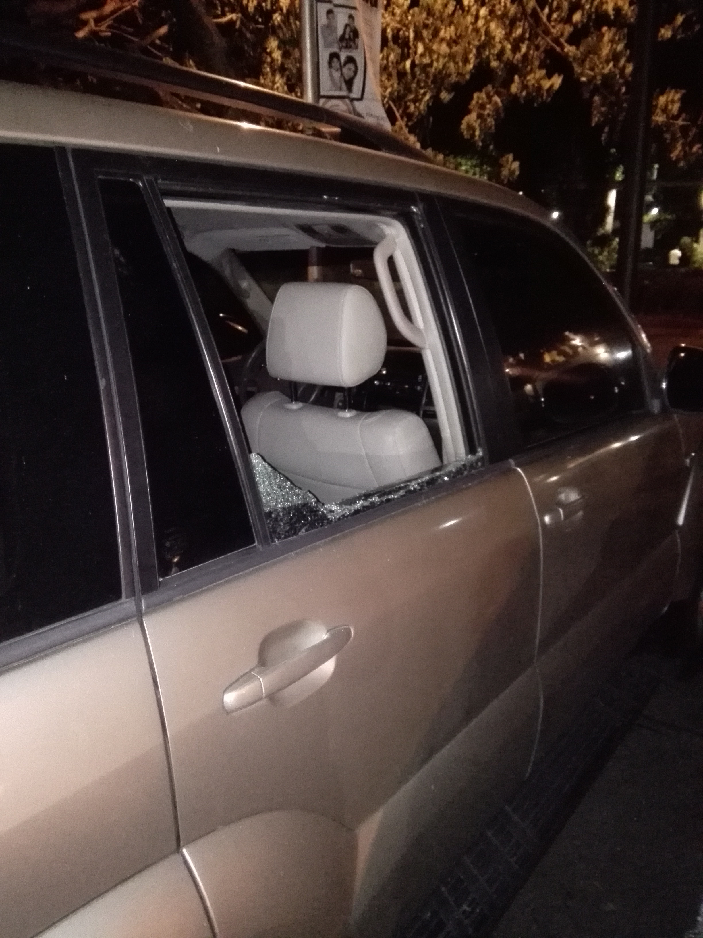 We discovered the thieves went through a passenger window behind the front passenger seat. It boggles me because they did not break the window where the laptop bag was located. I assume the thief didn’t want to get cut, or had delicate skin.