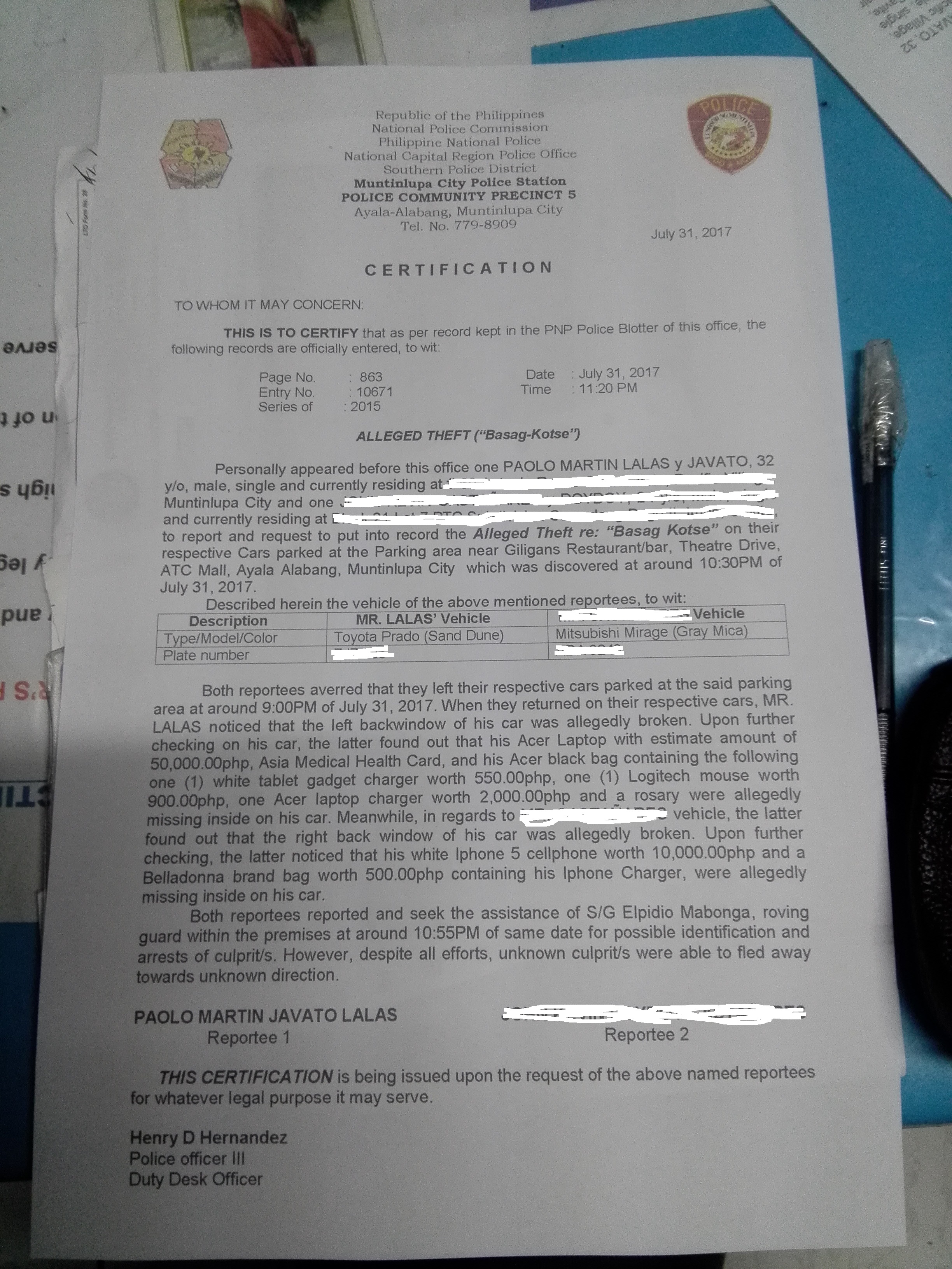 The dark car that parked beside me also had their car broken in, even though their car was heavily tinted. The owners of that dark car told me that no car alarm sounded for both theirs and mine. What I find disturbing is that I have a hunch that the people who parked right beside me in the red car were the ones who were also in cahoots with the robbers, whom I assumed were observing from another vehicle due to the nature of the way they were looking around. The police inspector said it’s why security guards do not entertain those staying in their vehicles in parking lots due to a link with car robberies. Also, I was suspicious of the tambay kids hanging about in the area (whom I assumed were also in cahoots with spies), while the police inspector was suspicious of the security personnel patrolling the area; the security personnel change guard around 9PM. The Alabang Town Center CCTV proved useless because it did not capture anything — it rotates left and right, and did not catch the moment I was robbed. All I have is a police report to take home.