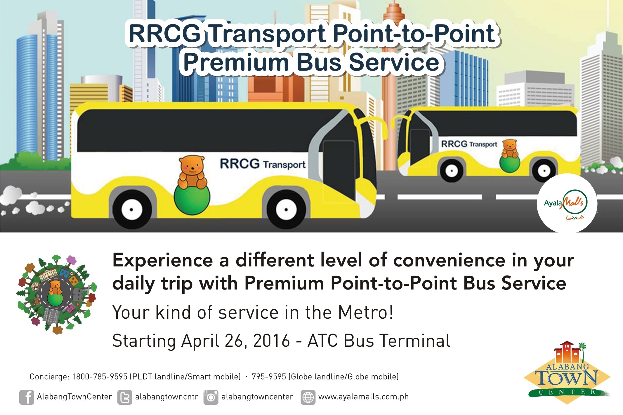 Alabang Town Center announces Point to Point bus service to and from Makati by AlabangBulletin · April 27, 2016 “Now you can go from Town to Makati and back with RRCG point-to-point premium bus service starting at 6:00 am up to 8:00 pm! A bus will be available at an affordable price every 30 minutes!” according to Alabang Town Center’s Facebook Page.