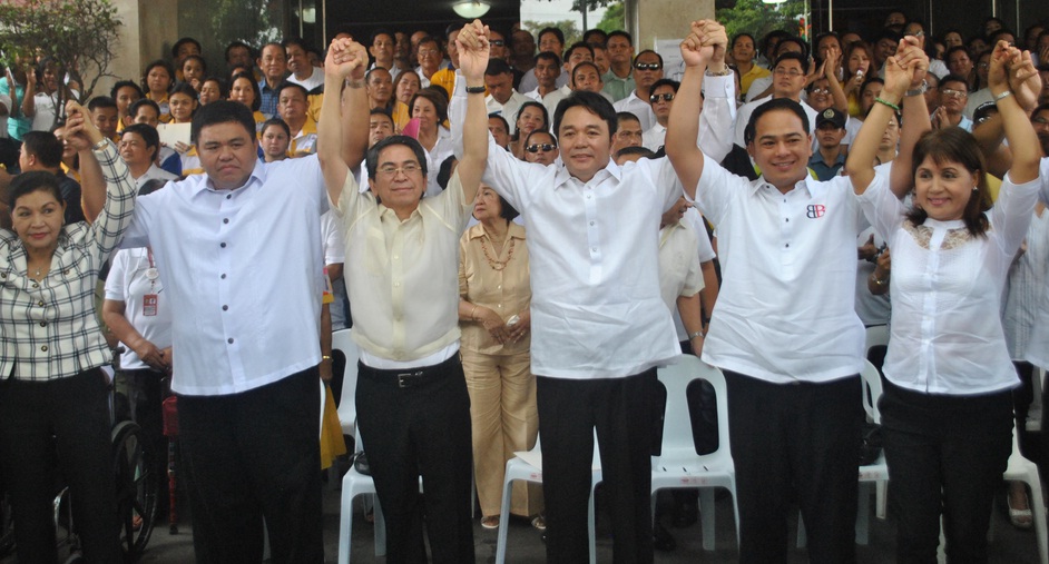 In photo: Outgoing P’que Mayor Florencio Bernabe, Jr. (second from left, front row) and 1st District Representative and Mayor-elect Edwin Olivarez (third from right) shake hands in friendship during the June 3, 2013 flag-raising ceremony as a gesture of reconciliation and willingness to work together in the interest of public service for citizen welfare and community development. Others in photo at front row: City Councilor and P’que 1st Dist. Representative-elect Eric Olivarez (right), Councilor-elect Tess de Asis (second from right) and Coun. Conchita Bustamante (left).