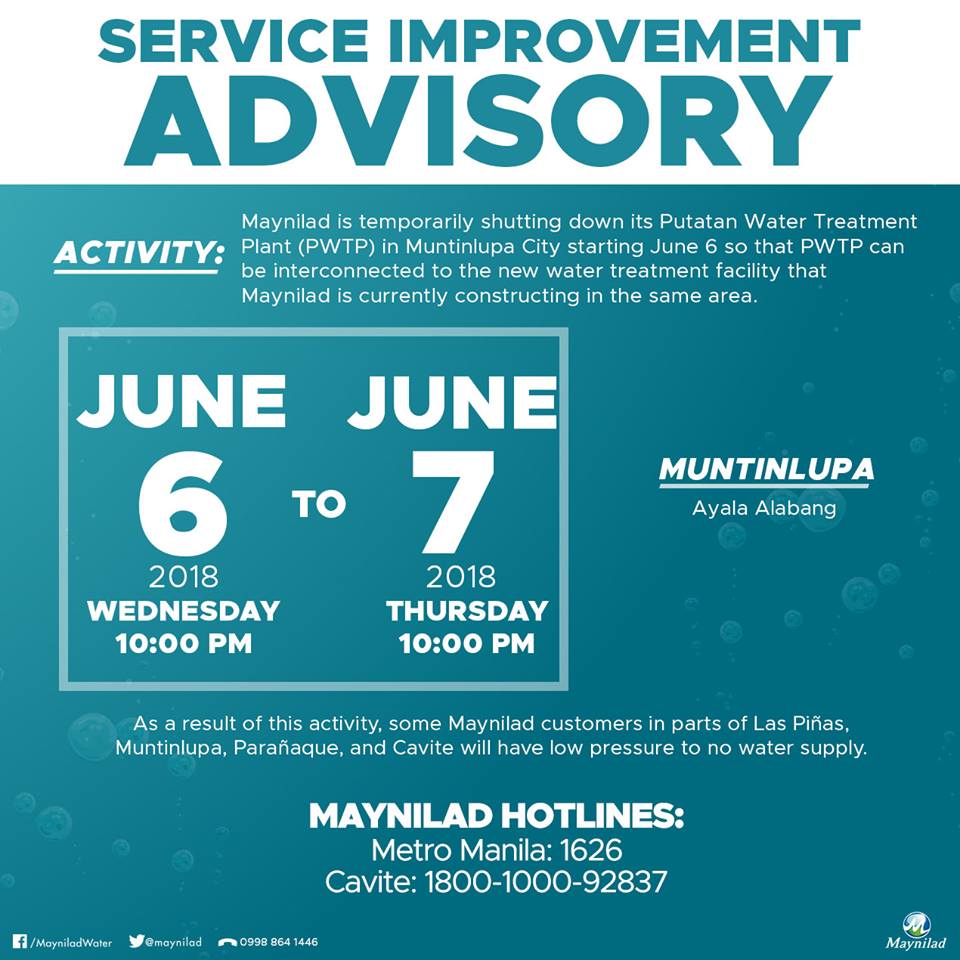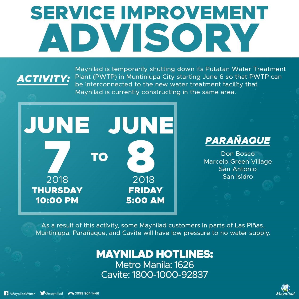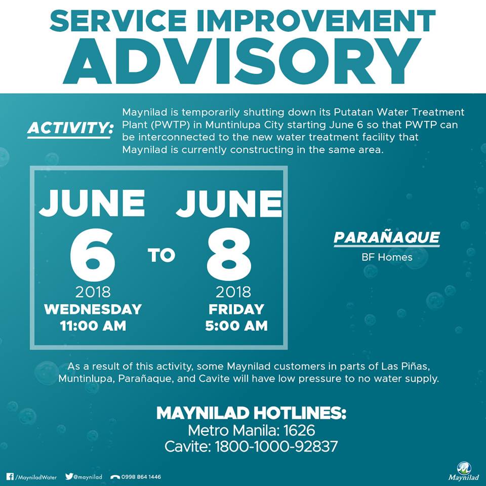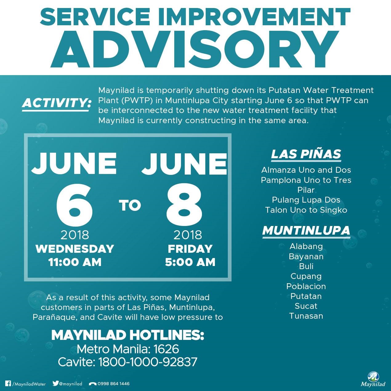 As a result of this activity, some Maynilad customers in parts of Las Piñas, Muntinlupa, Parañaque, and Cavite will have low pressure to no water supply starting 11 a.m. of June 6, 2018 (Wednesday) to 5 a.m. of June 8, 2018 (Friday) in these areas: