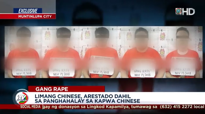 Arestado ang limang Chinese national habang pinaghahanap ang apat na iba pa matapos umano nilang halinhinang gahasain ang isang kapuwa Chinese sa isang hotel sa Muntinlupa City noong Martes.