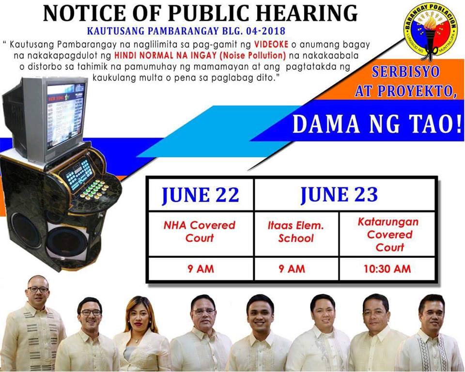 Barangay Poblacion residents are invited to attend several public hearings in relation to a Noise Pollution ordinance.