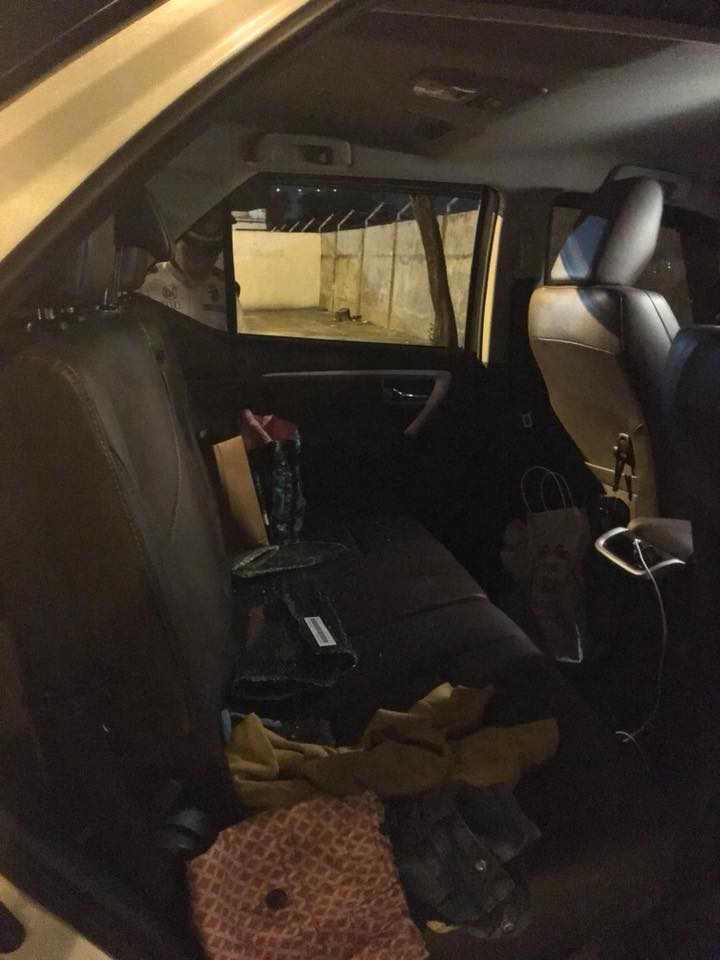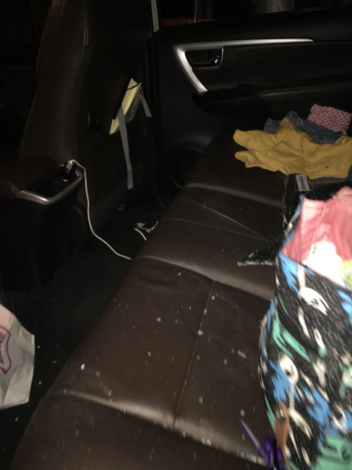At around 8 to 8:30pm, after finishing doing their grocery shopping, they discovered the rear window of their SUV to have been broken into.