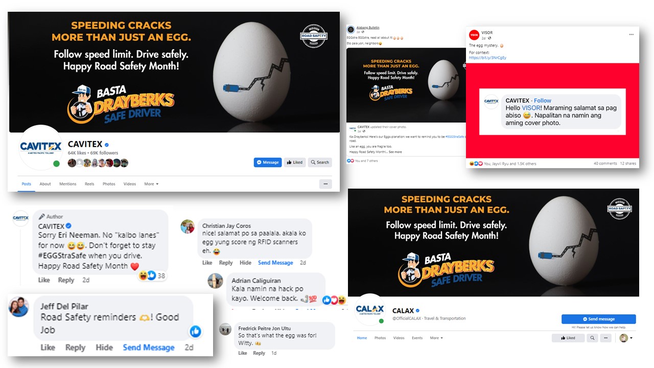 Until CAVITEX and CALAX give their side of the story to the netizens asking for an EGGS-planation to this mystery by updating their cover photo followed by a video post on May 1, Monday. It is revealed to be a clever tactic to draw attention for its Drayberk’s #EGGStraSafe digital campaign, in celebration of Road Safety Month this May (Presidential Proclamation No. 115-A).