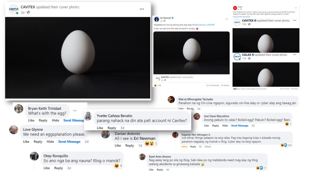 On Friday night, April 28, the cover photo of the official Facebook pages of the Manila-Cavite Expressway (CAVITEX) and Cavite-Laguna Expressway (CALAX) showed an image of an egg in an empty black space which seems to be irrelevant to the toll road company. Over the weekend, netizens were stirred and became curious about the provocative social media activity which started followers to share their theories on what this may be all about – is it a hack or a mistake?