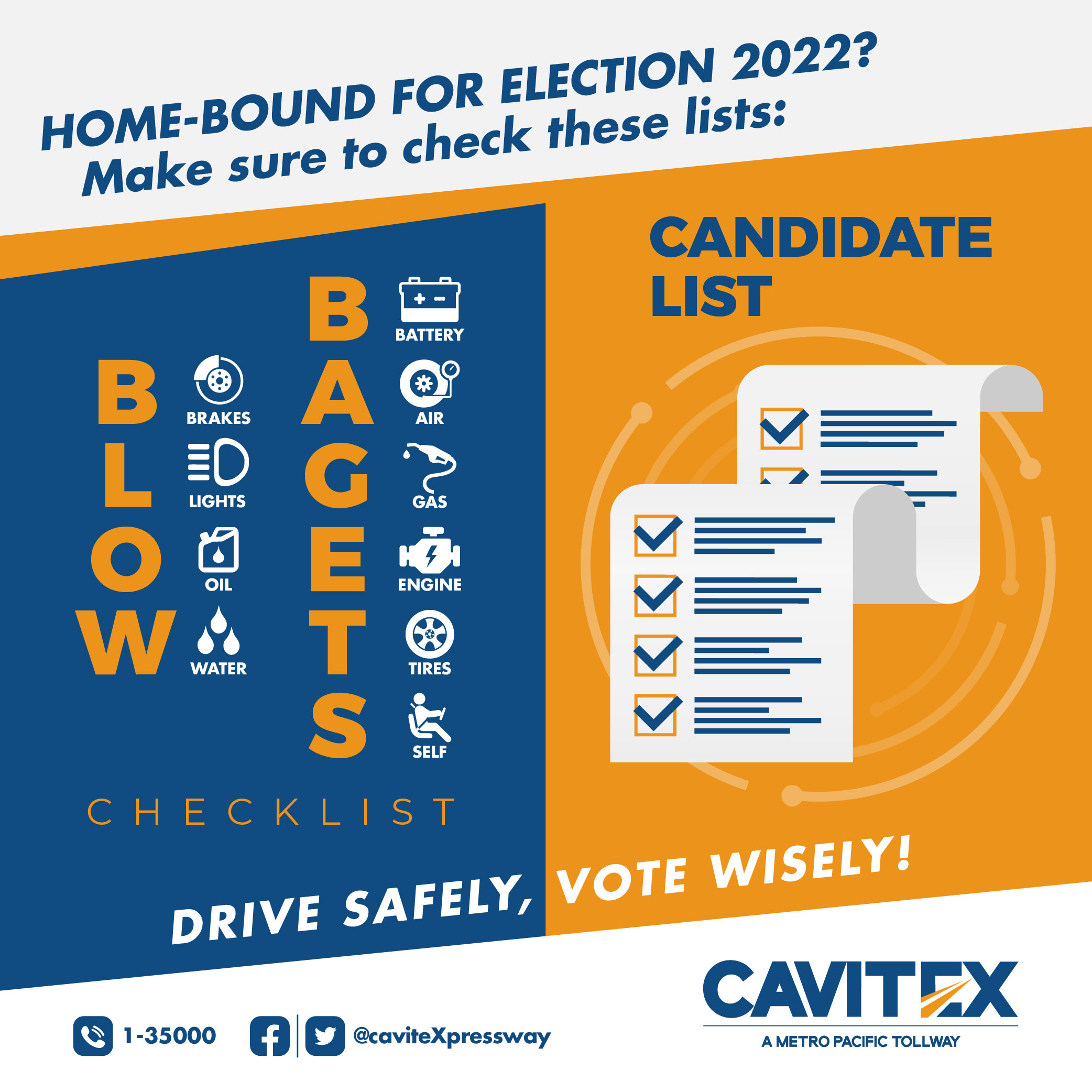 “Many voters are expected to hit the road and come home this election week to cast a vote for their candidates. This coming election day, always remember to vote wisely and drive safely. Aside from having a list of who to vote for, we strongly advise our motorists to include BLOWBAGETS car checklist before driving off,” said Mr. Raul L. Ignacio, Cavitex Infrastructure Corporation’s President and General Manager.