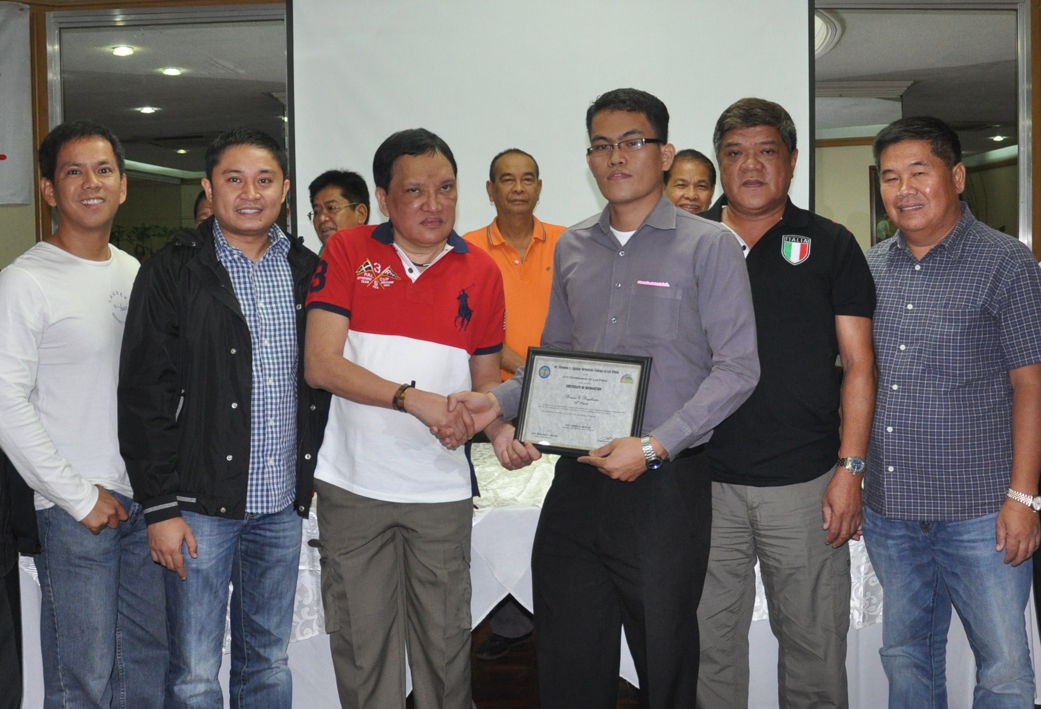 CPA BOARD TOPNOTCHER. Las Piñas City Mayor Vergel ‘Nene’ Aguilar (4th, left) congratulates Dennis Magallanes of Dr. Filemon C. Aguilar Memorial College (DFCAMC) as 10th placer in May 2011 Certified Public Accountancy Board Exam and 20 other passers. DFCAMC, a city run college education, garnered a 70% passing rate, one of the highest rates in the country. Mayor Aguilar grants a free quality four-year College degree and Information Technology education to more than 3,500 students yearly. With him (L-R), Councilor Rex Riguera, Councilor Carlo Aguilar, Vice Mayor Louie Bustamante and Councilor Henry Medina.