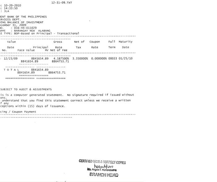 The allegation that the amount of Php10,183,678.03 is MISSING is pure FICTION sufficiently explained to COA who claimed that DBP FAILED TO INCLUDE AN INVESTMENT MANAGEMENT ACCOUNT AMOUNTING TO P8,841,654.89 and a disbursement by way of bank to bank transfer amounting to P1,866,480.00 (see attachment)