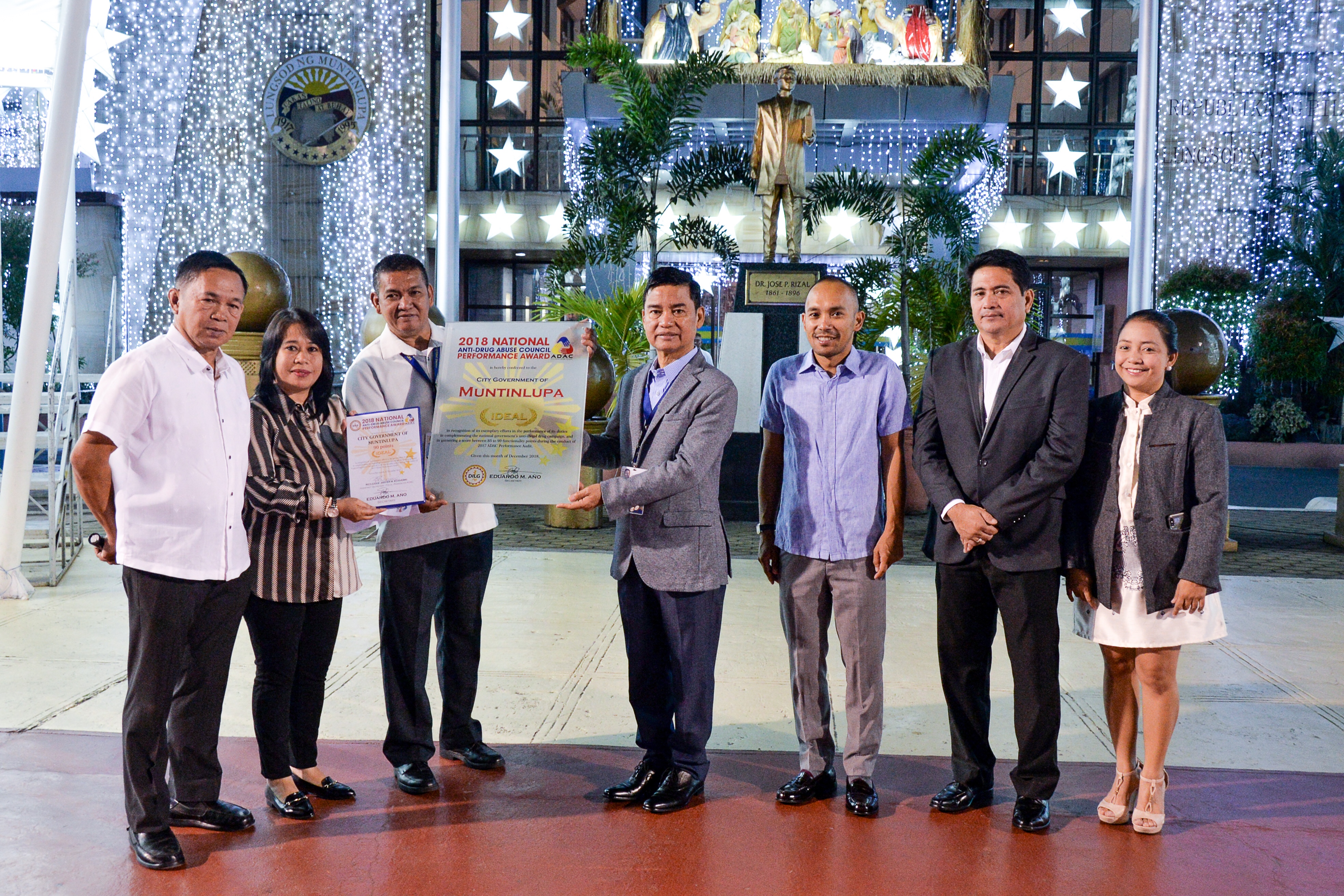 Department of Interior and Local Government – Muntinlupa director Bing Ferino (2nd from left) conferred an “Ideal” status marker to Mayor Jaime Fresnedi (center) on January 7 for the local government’s outstanding initiatives in building drug-free communities. Muntinlupa City earned the high standing for garnering 90 points in DILG’s Anti-Drug Abuse Council on 2017. Further, the City Government was lauded for its exemplary efforts in complementing the national government’s anti-illegal drug campaign. Shown in the photo are Drug Abuse Prevention and Control chief (Ret.) Col. Florecito Ragudo, Coun. Alan Camilon, Coun. Louie Arciaga, and Coun. Ivee Tadefa.
