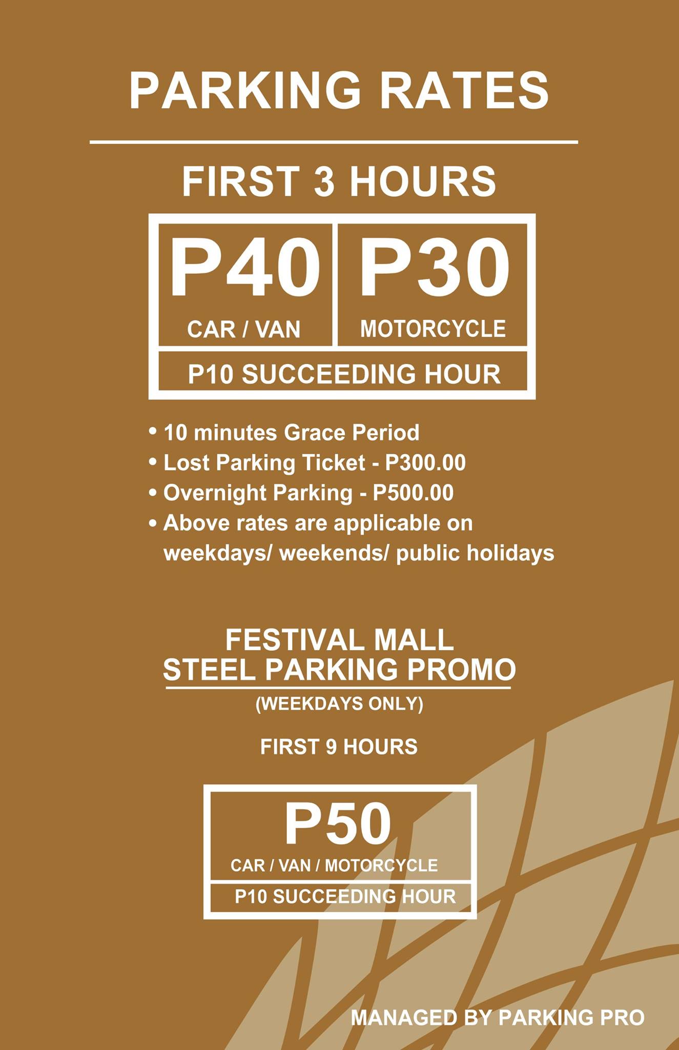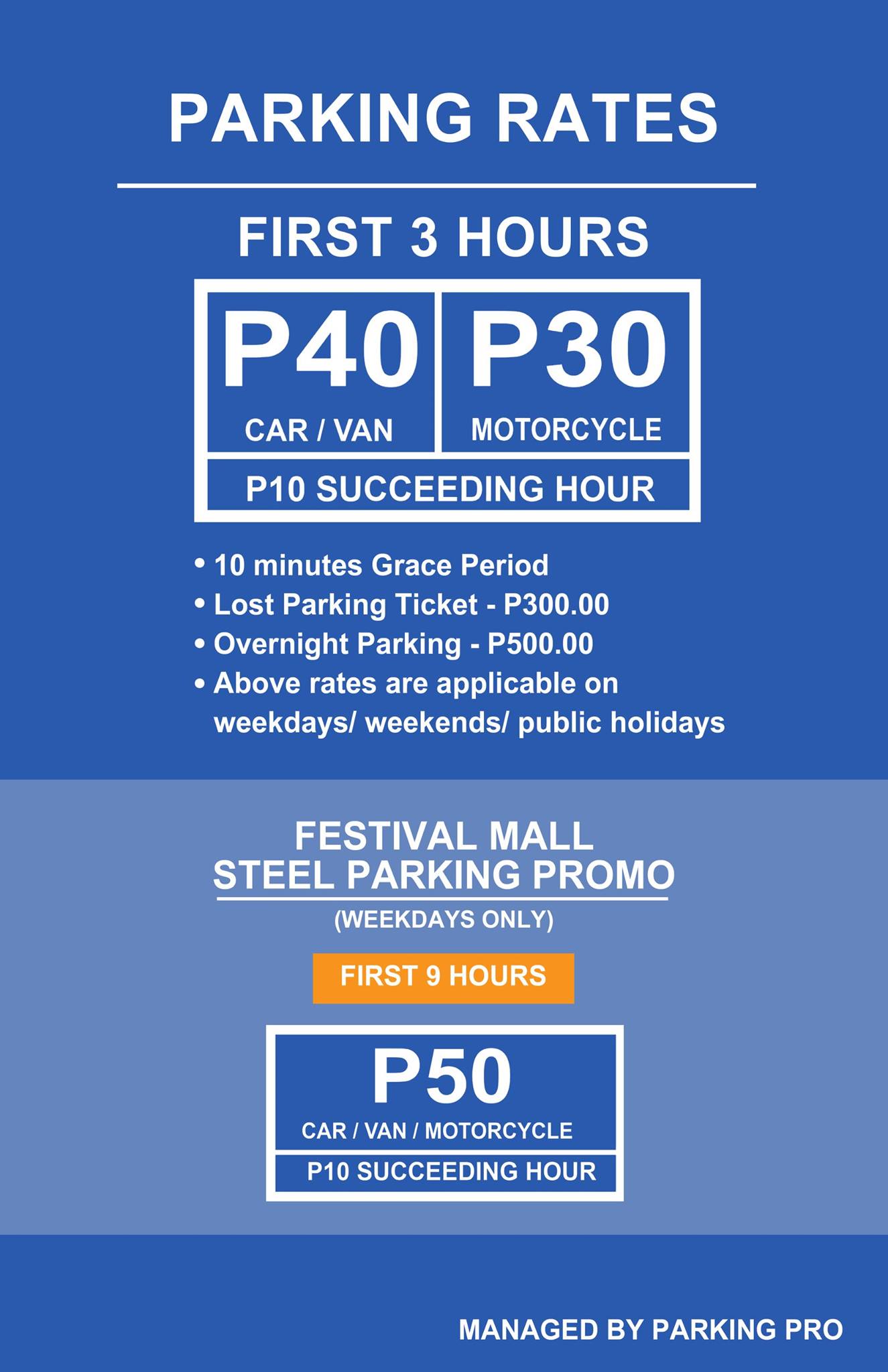 “Motorists opting for longer parking hours during weekdays can proceed to Festival Mall Steel Parking. Rate is at Php 50.00 for the first 9 hours and succeeding hour is at Php 10.00,” said the two in their Facebook posts.