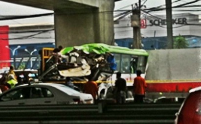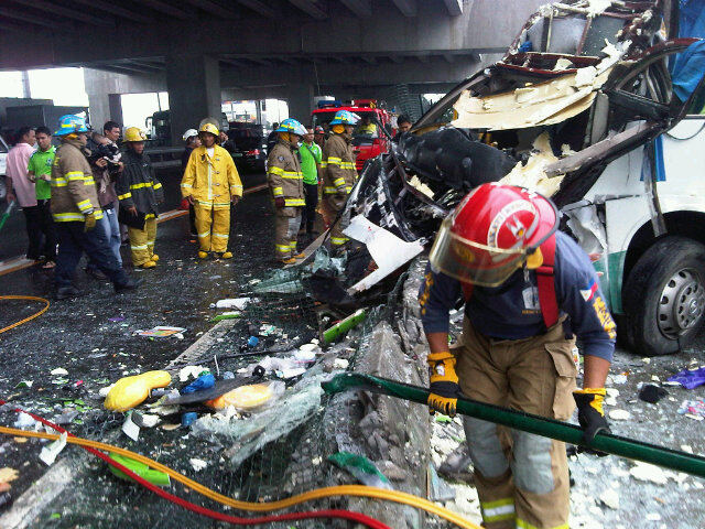 The most logical explanation to this from scientific POV is HYDROPLANING where the bus was already cruising at 7.7 times the square root of the tire pressure where REVERTED RUBBER condition was achieved. At the onset of hydroplaning caused by the relatively thick layer of water due to heavy rains and the bus travelling at relatively high speed, the driver noticed uncontrollable steering while braking. Tendency is to apply more heavy braking, then the wheels (tires) locked and the water developed into a steam, reverting the tire to uncured state and hence more uncontrollable steering sending the bus to the Skyway gutter, broke it and went 30 feet down . Evidence!? See the tire rim without the rubber!
