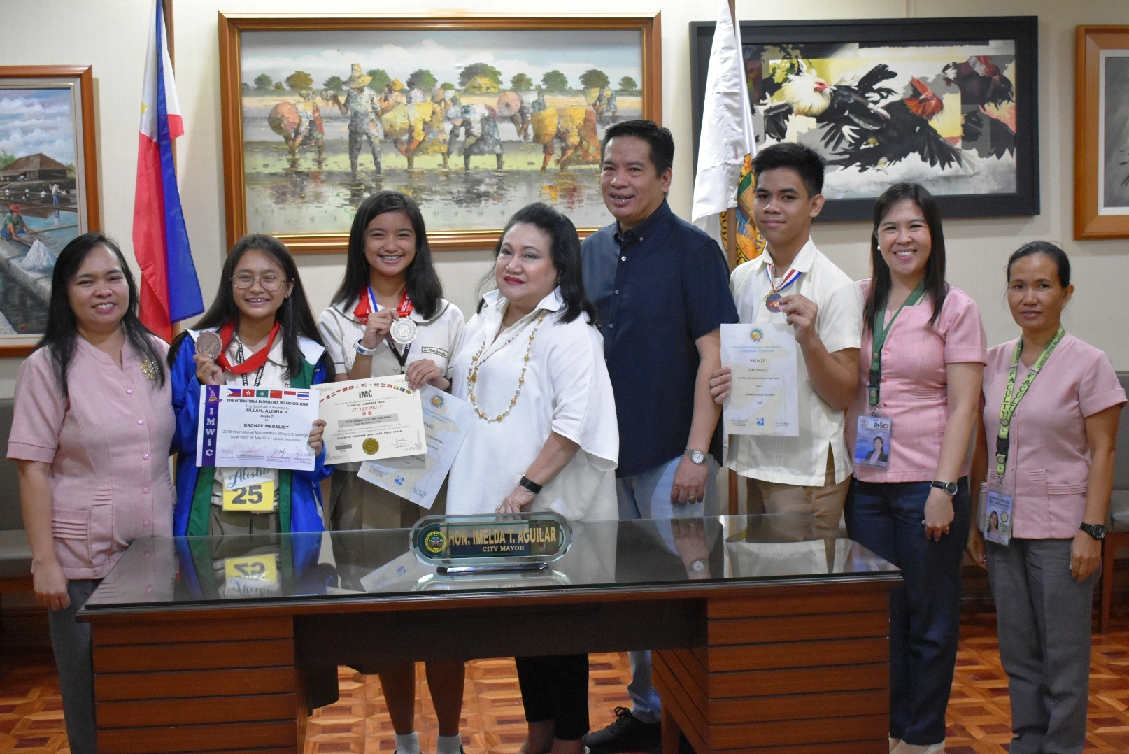 Students from Las Piñas City National Science High School won in international mathematics competition held in Singapore, Indonesia, and the Philippines. Mayor Imelda T. Aguilar (center) congratulated the young math wizards, namely, Coleen Adrianne L. Panganiban (3rd from left) – Silver Medalist at the 14th International Mathematics Contest held in Singapore from July 27-30; Alisha V. Ullah (2nd from left) – Bronze Medalist at the 2018 International Mathematics Wizard Challenge in Indonesia; and Gian Gaviola (3rd from right) – Bronze Medalist at the International Kangaroo Mathematics Competition (Philippine leg).