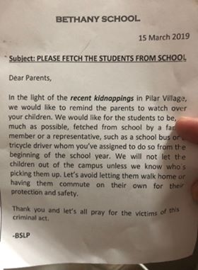 “In the light of recent kidnappings in Pilar Village, we would like to remind the parents to watch over your children,” said Bethany School in their advisory.