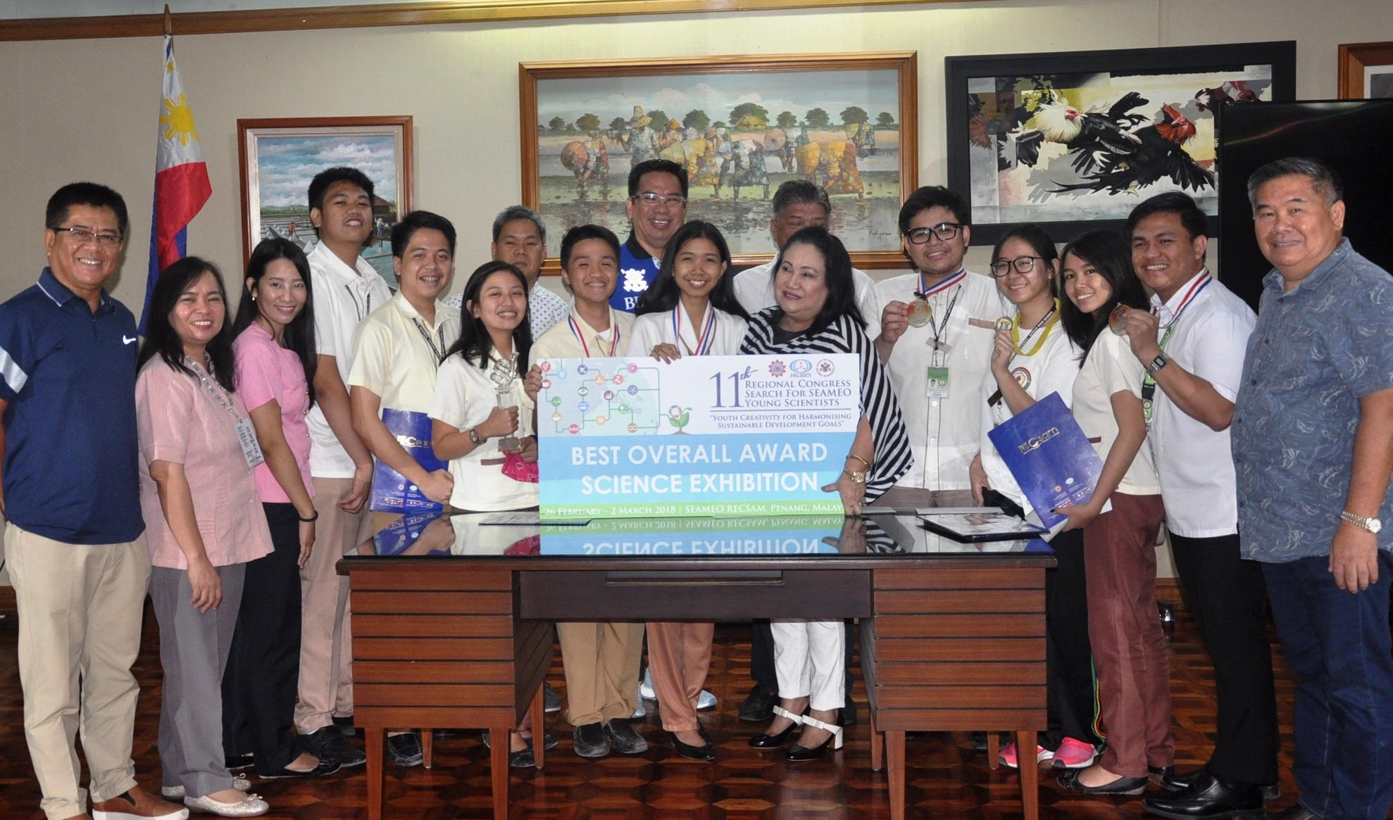 Mayor Imelda ‘Mel’ Aguilar congratulated the students of Las Piñas Science High School for winning in the recently concluded national and international science competitions. Angelica Remillano won at the National Science and Technology Fair held at Tagaytay City. Marion Rodel Miñano, Lorenz Simoun de la Cruz, Khristine Bancod, and Angela Apolonio won the Best Overall Award for Science Exhibition while Jan Elizabeth Bacar, Alyssa Mae Evardone, Jezreel Angelo Tan , Joseph Lloyd Naguit won the Outstanding Research paper at Penang, Malaysia. With the students during their courtesy call to Mayor Aguilar were Dr. Loreta Torrecampo (Schools Division Superintendent) and their advisers Mr. Genesis Agcaoli and Ms. Ayra Patricia Alvero. Likewise present were Vice Mayor Louie Bustamante, Councilors Danny Hernandez, Renan Riguera, Mark Anthony Santos, and Henry Medina.