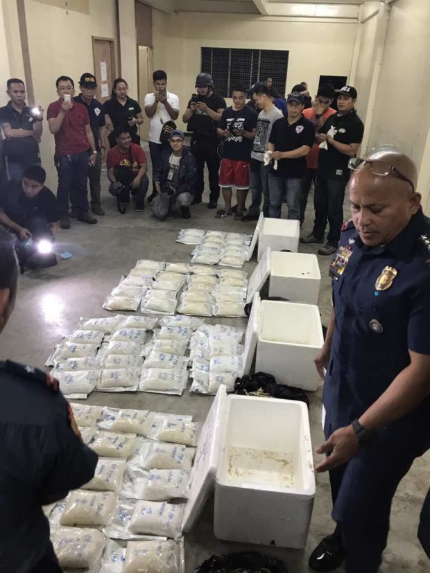Police chief Director General Ronald “Bato” dela Rosa, who joined the raid, said 72 packs of shabu, weighing a kilo each, were found concealed under black plastic bags of dried fish (tuyô) and dried mangoes inside four styrofoam boxes.