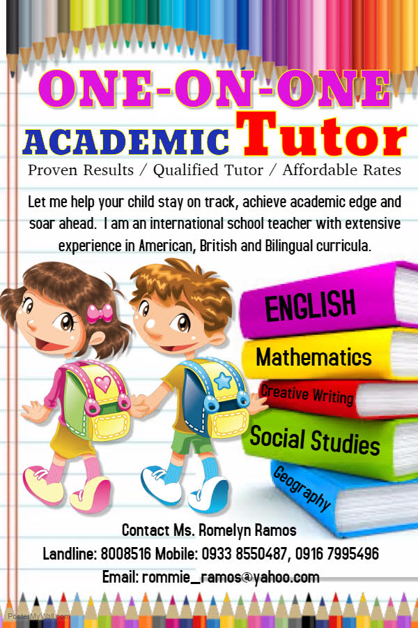 Looking for a One-on-One Academic Tutorial Services in the area? Please see here. by AlabangBulletin · March 10, 2017 Contact Ms. Romelyn Ramos for your English or Math tutorial now. Call landline 8008516, or text 0933 8550487 or 0916 7995496 to schedule.