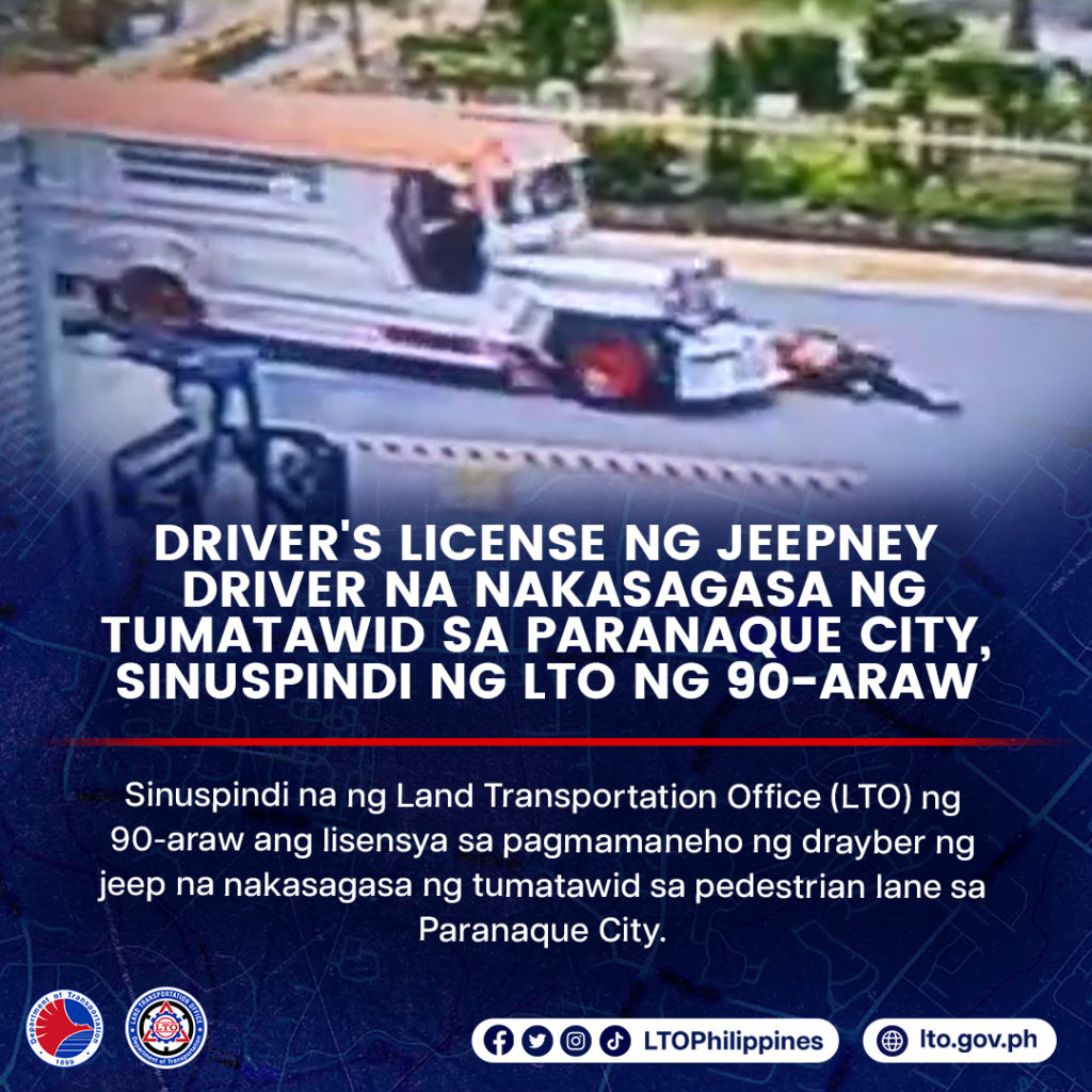 MANILA, Philippines — The Land Transportation Office (LTO) has suspended the license of the jeepney driver who bumped a woman crossing the pedestrian lane in Parañaque City.
