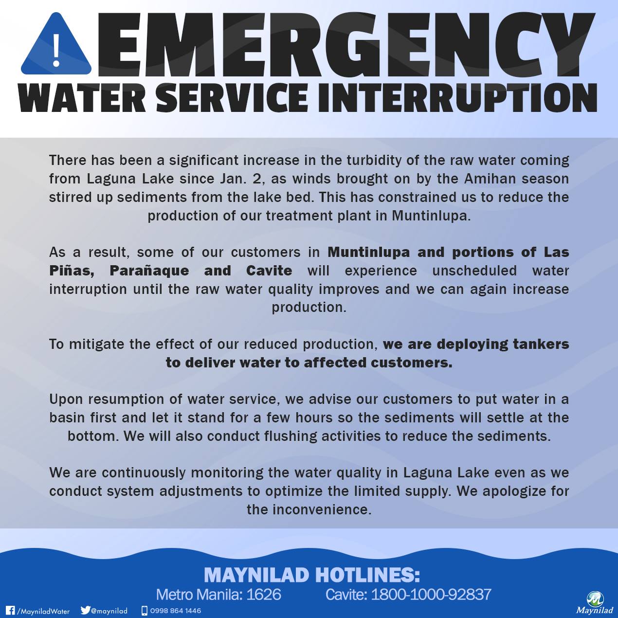 “There is an unscheduled water supply interruption and significant increase in the turbidity affecting our customers in Muntinlupaand portions of Las Pinas, Paranaque and Cavite City due to the Amihan season’s winds stirring up the sediments of Laguna Lake’s lake bed. This has constrained us to reduce the production of our treatment plant in Muntinlupa,” mentioned Maynilad in their Facebook account.