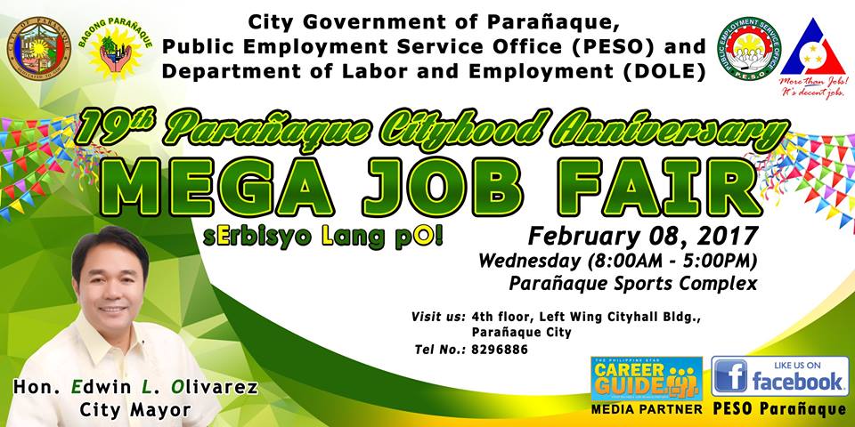 The Parañaque City Government, Office of the Mayor through the Public Employment Service Office (PESO) in coordination with the Department of Labor and Employment(DOLE) – MUNTAPARLAS F.O and Philippine Overseas Employment Administration (POEA) will conduct a Mega Jobfair on February 08, 2017 (Wednesday) from 8 AM to 5 PM at the Parañaque Sports Complex.