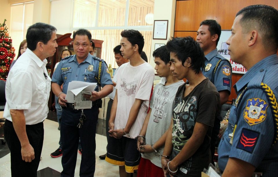 Parañaque City Mayor Florencio Bernabe, Jr. (left) questions suspected motorbike thieves who were apprehended by members of the Parañaque PNP and security personnel (barangay tanod) of Barangay Don Bosco after stealing a Yamaha Mio motorcycle along Doña Soledad Extension in Brgy. Don Bosco.