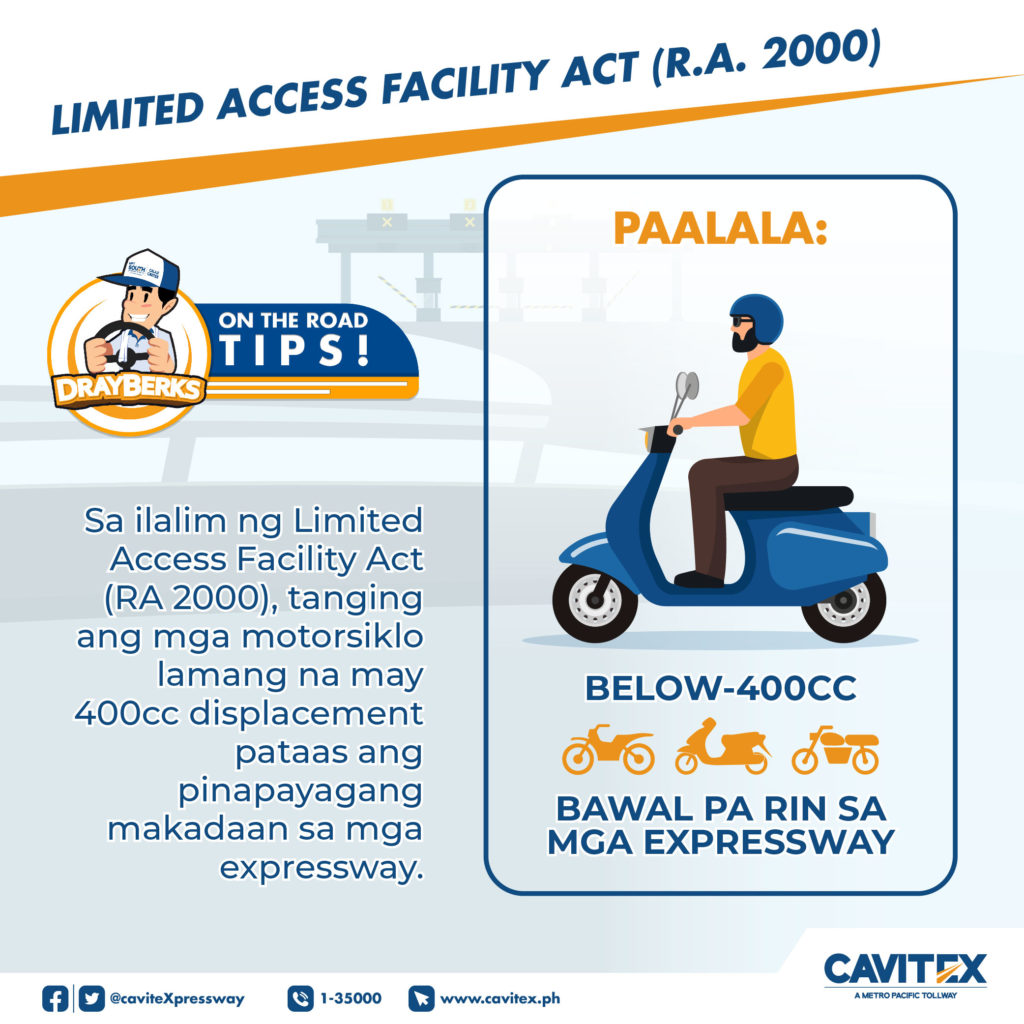 Metro Pacific Tollways South (MPT South), a subsidiary of Metro Pacific Tollways Corporation (MPTC), continues to remind motorists to obey the Limited Access Facility Act (Republic Act 2000) which prohibits the entry of motorcycles with engine displacement less than 400cc in expressways, including the Manila-Cavite Expressway (CAVITEX), its CAVITEX C5 Link Segment, and the Cavite-Laguna Expressway (CALAX).
