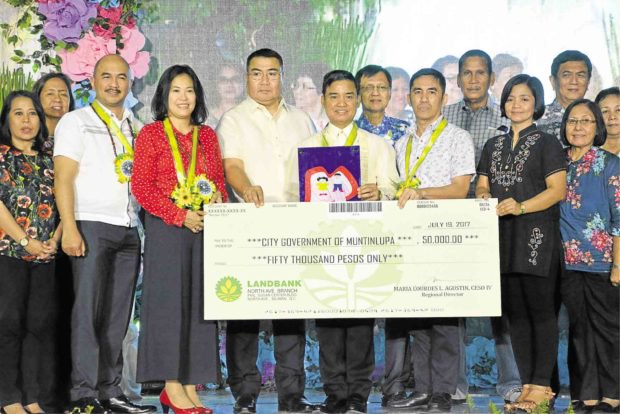 untinlupa Mayor Jaime Fresnedi (center) on Wednesday receives a P50,000 check as head of the “most child-friendly city” in Metro Manila. —CONTRIBUTED PHOTO