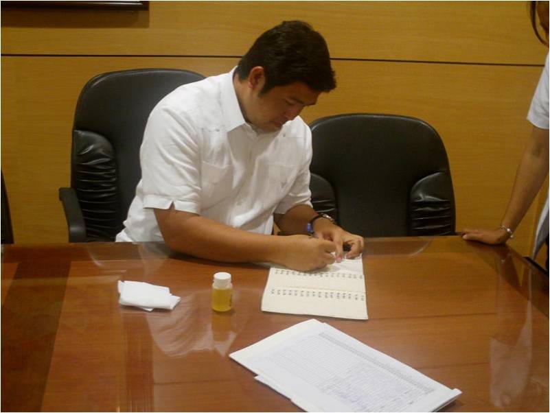 Muntinlupa City Mayor Aldrin San Pedro fills out a paper accompanying a urine sample of his own as he submits himself to drug testing conducted by the city’s Drug Abuse Prevention and Control Office (DAPCO).
