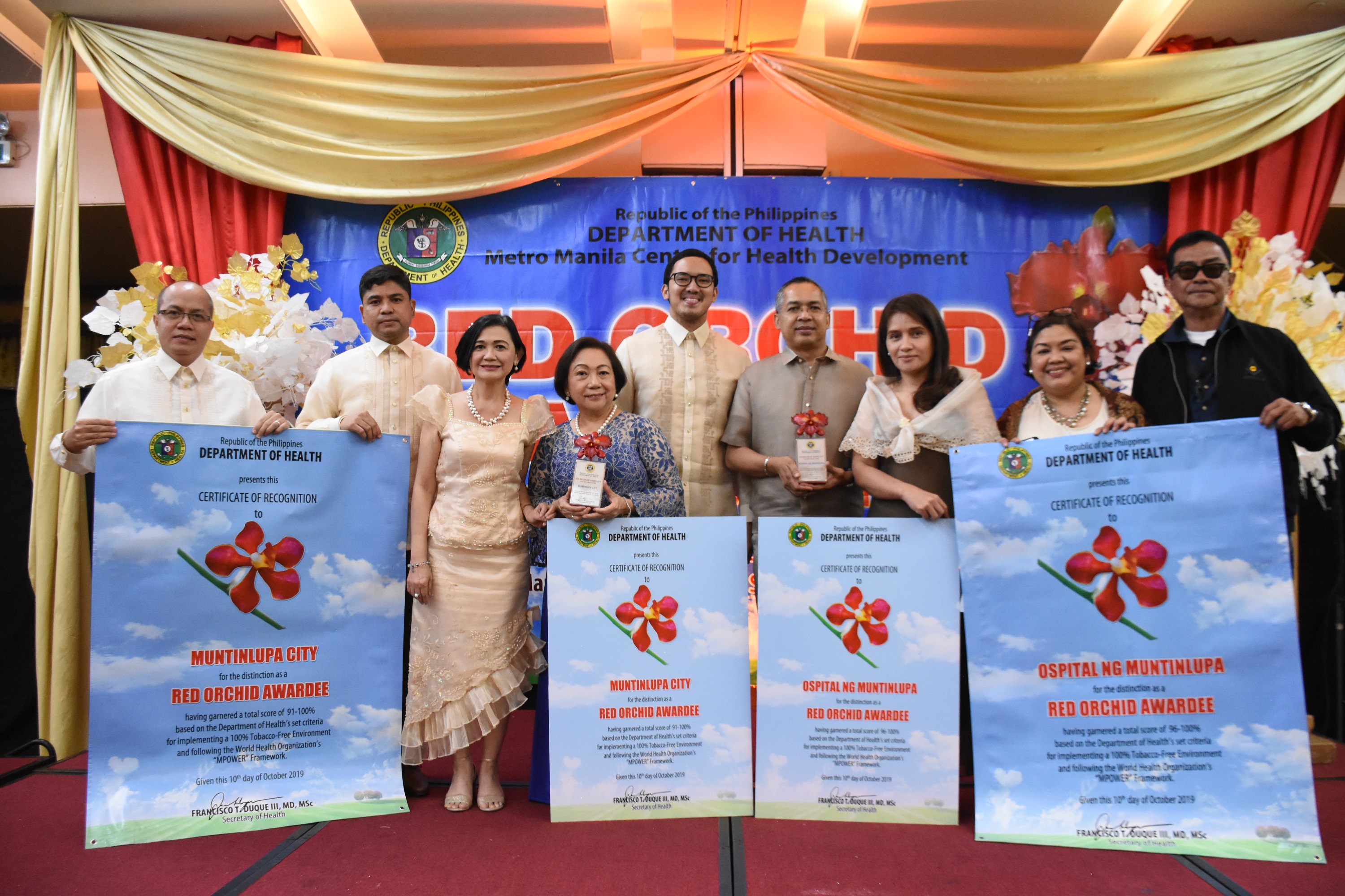 For the second consecutive year, the Department of Health (DOH) confers the Red Orchid Award to the local government of Muntinlupa in recognition of its outstanding initiatives against tobacco use. Muntinlupa City Health Office executives received the citation during an awarding ceremony last October 10 at Manila Grand Opera Hotel, Sta. Cruz, Manila City. The Ospital ng Muntinlupa was also recognized as a Red Orchid Awardee. Muntinlupa City is one of the pioneering LGU to implement smoking-ban through an ordinance in the NCR. Shown in the photo: Coun. Alexson Diaz, City Health Officer Dra. Maria Teresa Tuliao, CHO consultant Dra. Magdalena Meana, and OsMun director Dr. Edwin Dimatatac.