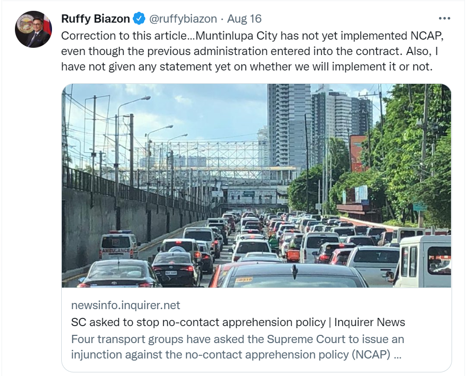 In a tweet last August 16, 2022, Muntinlupa Mayor Ruffy Biazon clarified that amidst a news article claiming Muntinlupa is one of the cities implementing the No Contact Apprehension Policy, he has not given his approval of its implementation in the city.