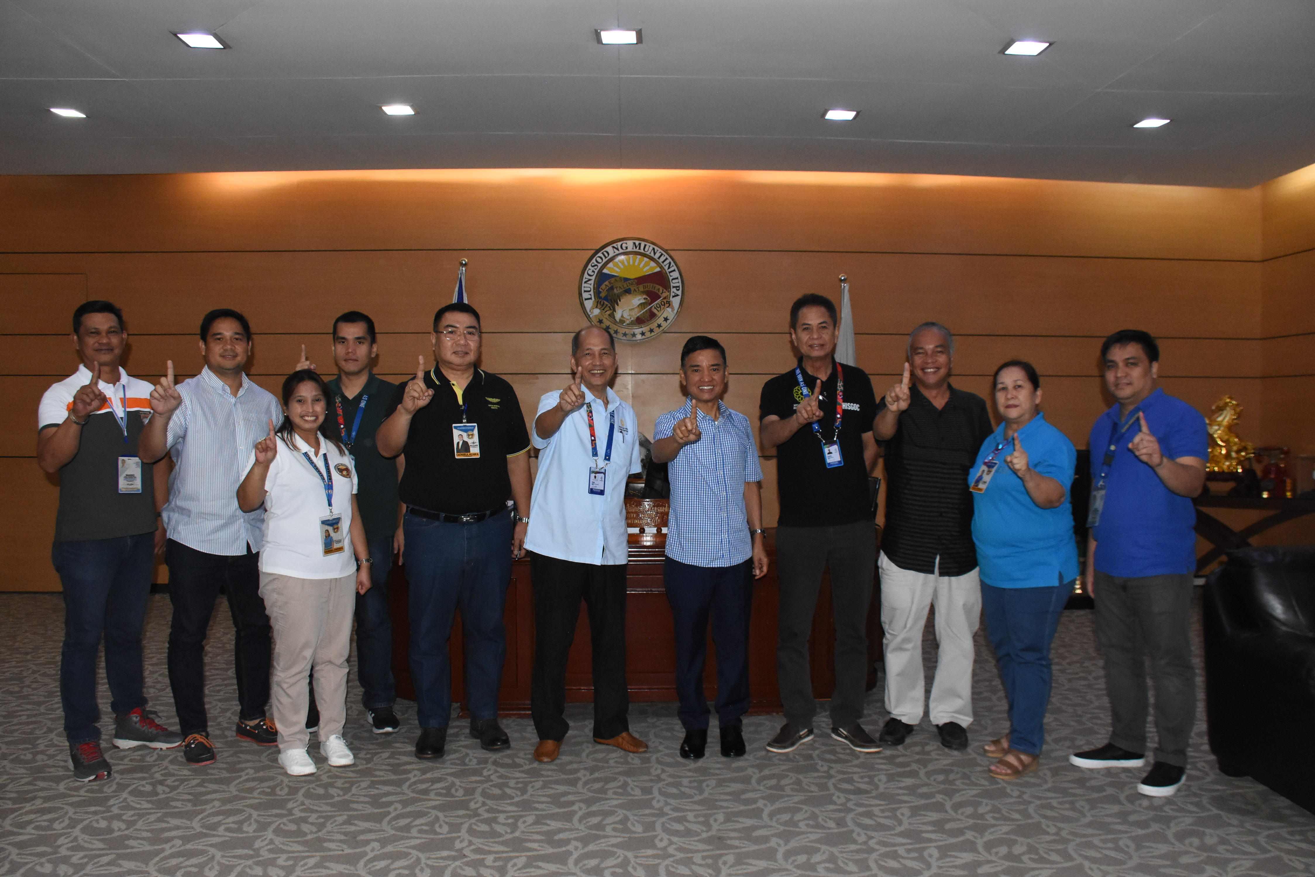 Philippine Southeast Asian Games Organizing Committee (PHISGOC) executive director Tom Carrasco and Operations Manager Chito Manuel paid a courtesy visit to Mayor Jaime Fresnedi last August 23 to discuss logistical arrangements of a SEA Games event in Muntinlupa City. The badminton tournament of the 30th SEA Games in December will be held at Muntinlupa Sports Center. Also shown in the photo are City Administrator Engr. Allan Cachuela, City Architect Don Causapin, Environmental Sanitation Center chief Lorna Misa, and Youth Affairs and Sports Development Officer Cynthia Viacrusis.