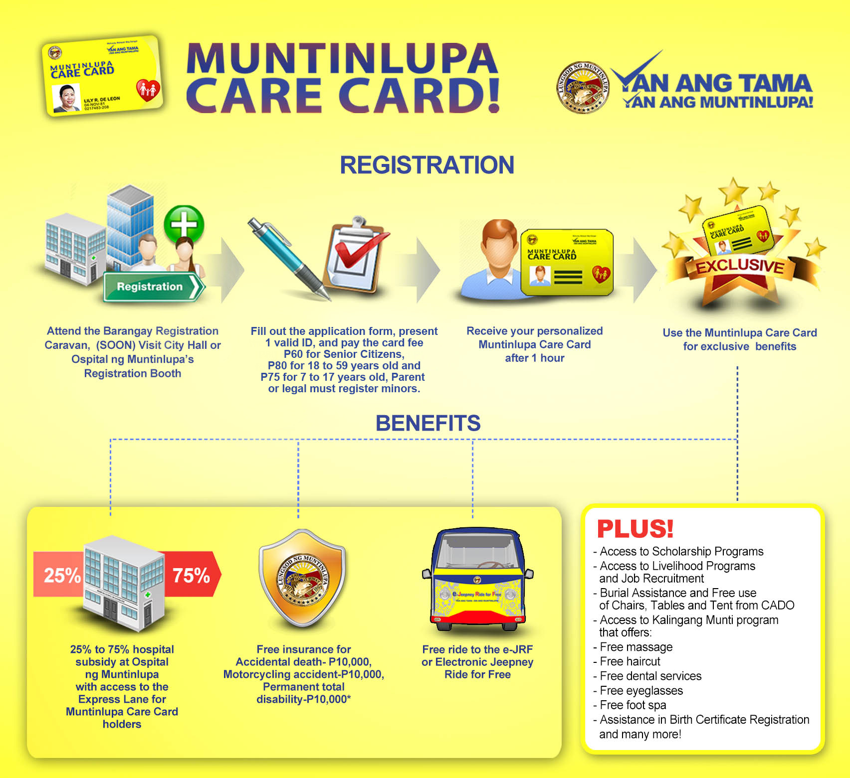 MCC holders enjoy benefits including: up to P25,000 hospital subsidy at the local health institution Ospital ng Muntinlupa; free insurance for accidental death and disablement, motorcycle accident, and permanent total disability; free ride in the city’s electronic jeepney or e-JRF (electronic-Jeepney Ride for Free); and others.