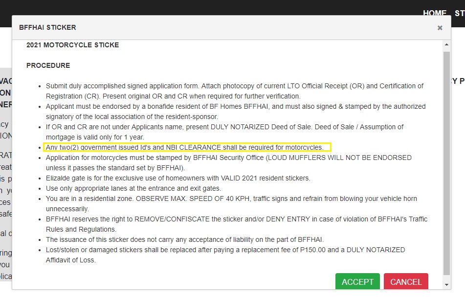 Perhaps for safety and to better ensure that no criminals enter the subdivision, the BF Federation of Homeowners Association, Inc. has added an NBI or Police Clearance to the list of requirements for non-resident motorcycle stickers.