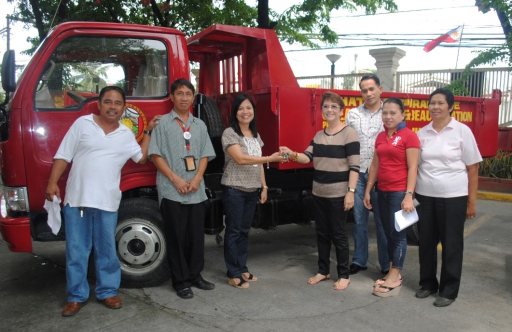 The City Government of Parañaque under the leadership of Mayor Florencio Bernabe, Jr. recently acquired a new dump truck to be used for its cleanliness and beautification campaign. In photo: Joined by CBP employees, Cleanliness & Beautification Program Chairperson Ms. Maria Fe Bernabe (fourth from right) and Engineering Asst. Dept. Head Engr. Miriam Parungao (third from left) pose by the new dump truck.