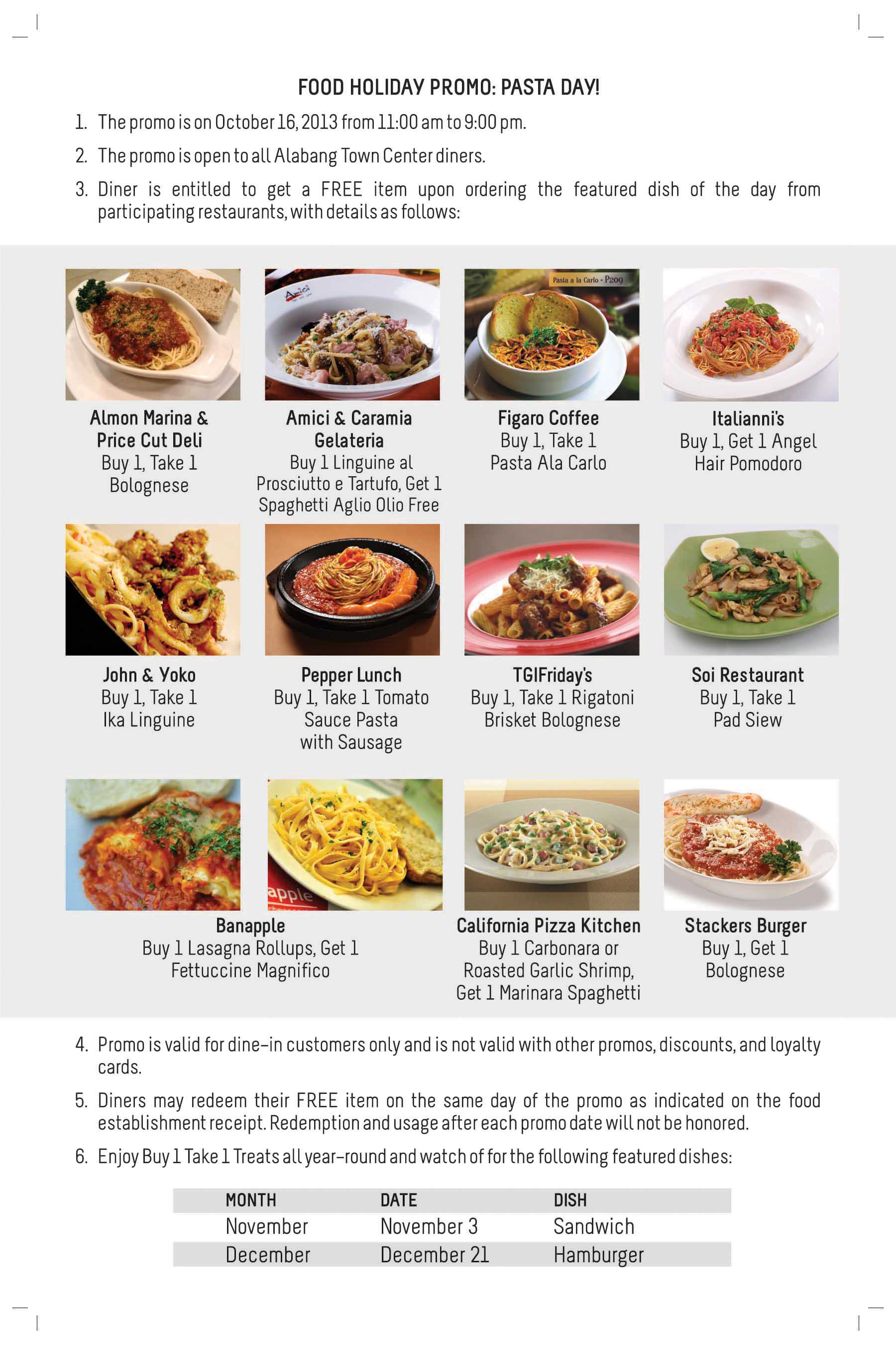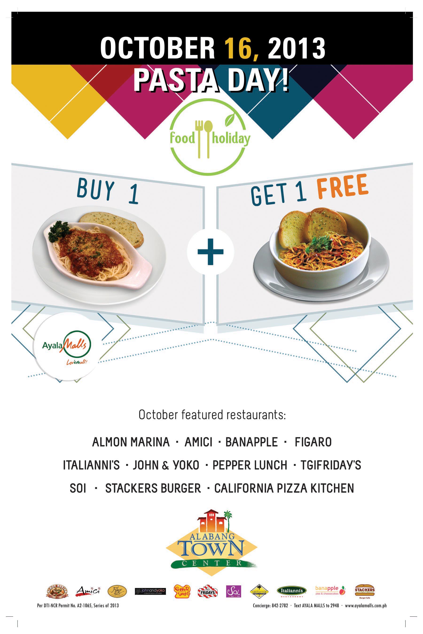October 16 is Pasta Day at Alabang Town Center! Buy 1, Get 1 FREE! by AlabangBulletin · October 7, 2013