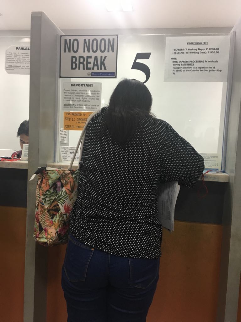 After punching a hole on your old passport (if for renewal), making sure your information is correct and asking you what type of delivery you wish to avail, you will then be given a payment form and told to go to the cashier.
