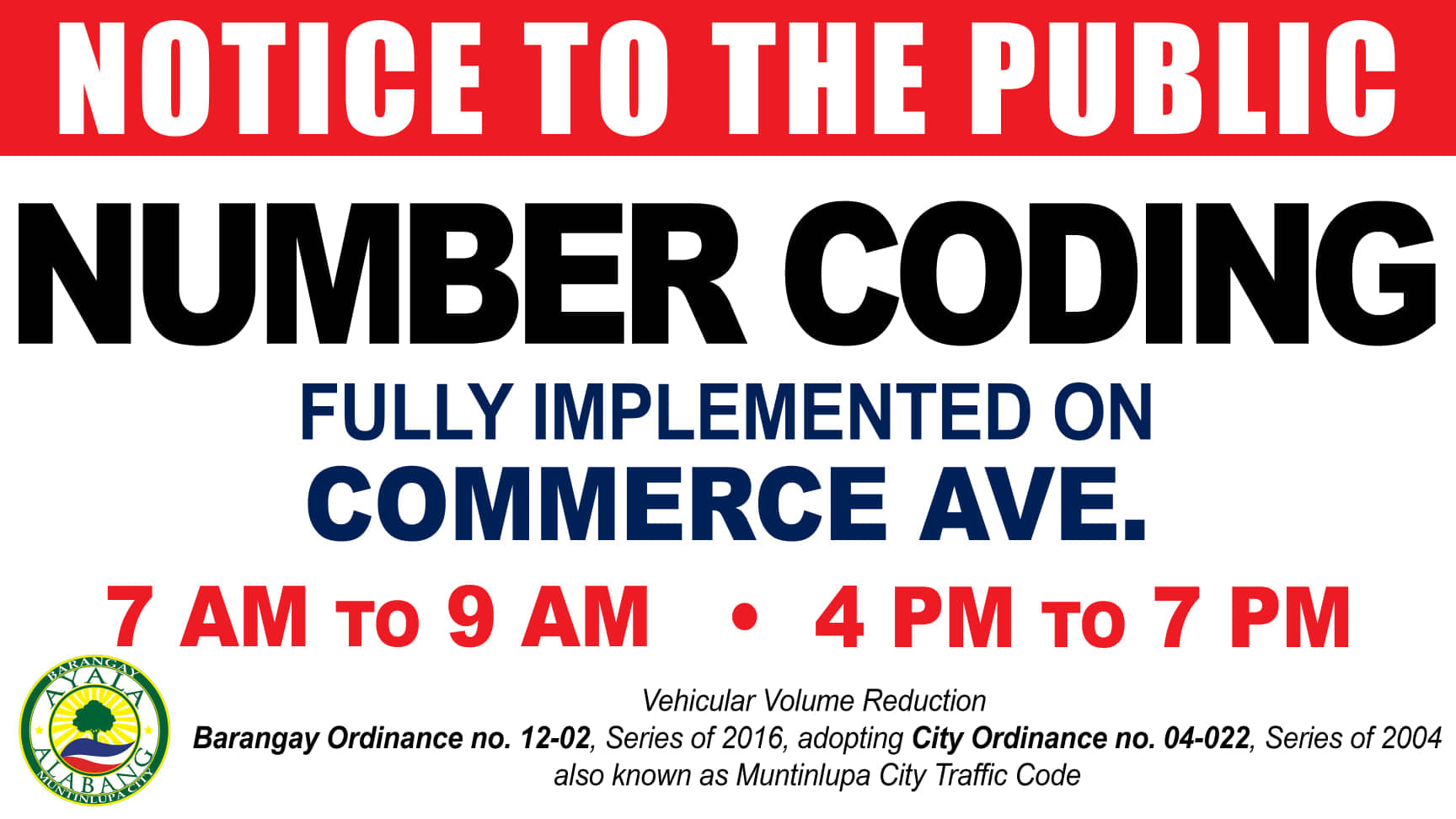 In Muntinlupa, only Commerce Ave. and Alabang-Zapote portions employ the Number Coding Scheme.
