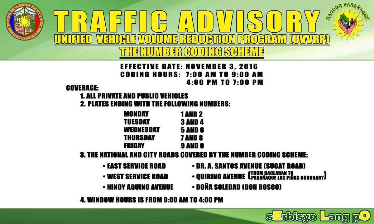 This means that in Paranaque, the following roads where the Number Coding Scheme is being implemented will still have the Window Hours of 9am to 4pm: