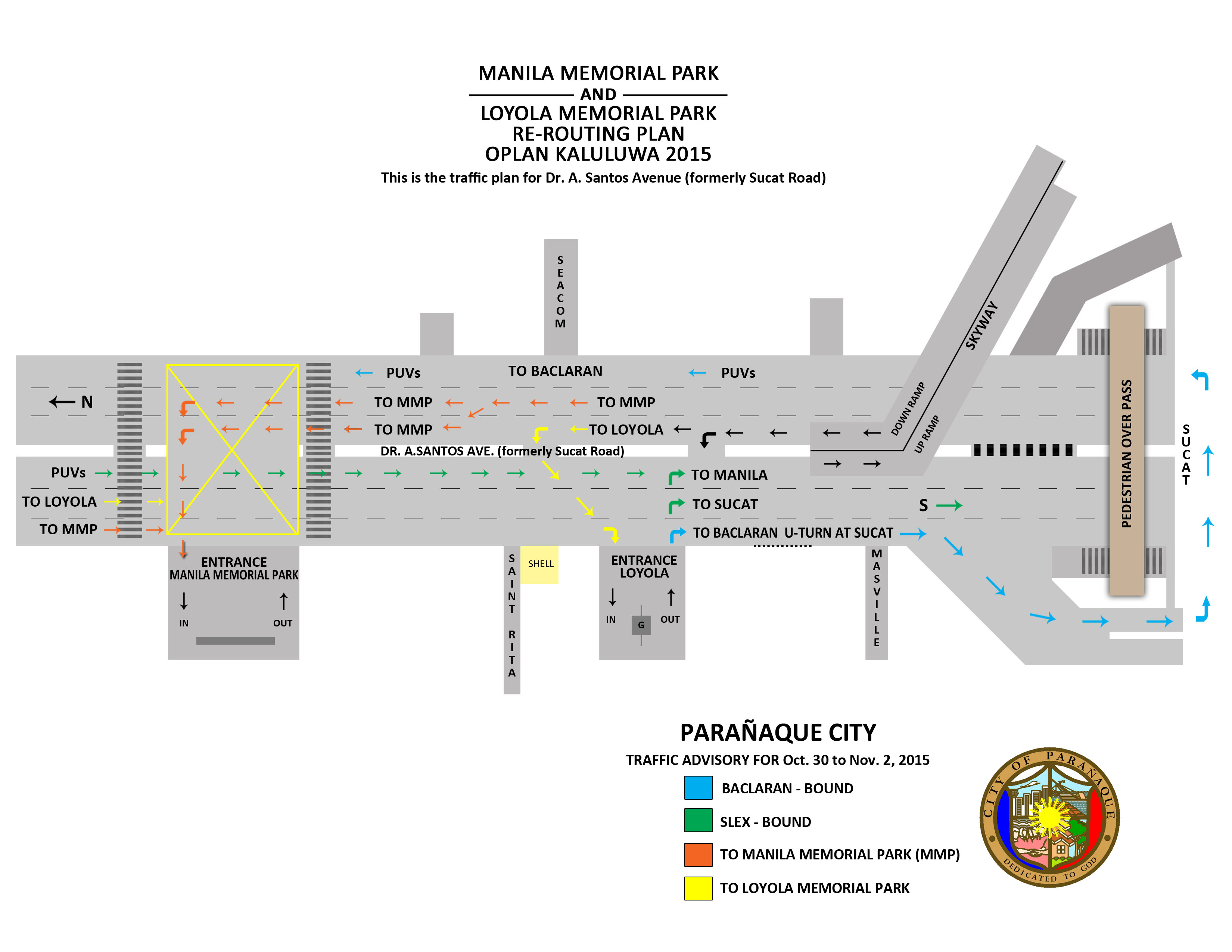 The rerouting will mainly be along Dr. A. Santos Avenue (formerly Sucat Road) where two big private cemeteries, Manila Memorial Park and Loyola Memorial Park, are located. The city has also a sprawling public cemetery, Palanyag, in Barangay San Dionisio.