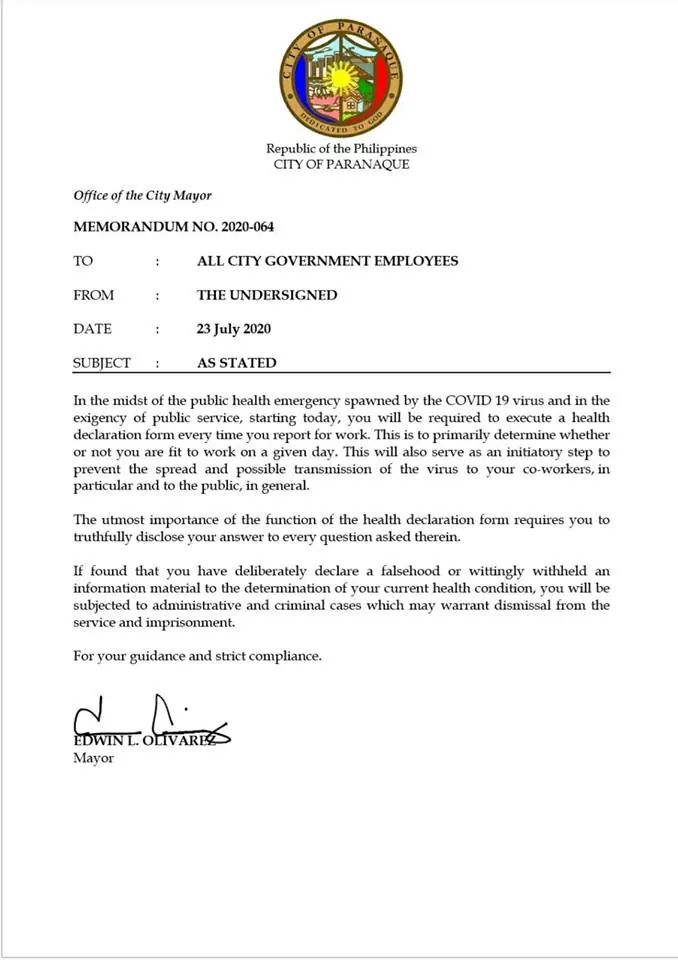 To further combat the spread of Covid-19 within the city and to police its own ranks, Parañaque Mayor Edwin Olivarez today issued a memorandum requiring all city government employees to accomplish health declaration forms every time they report to work.