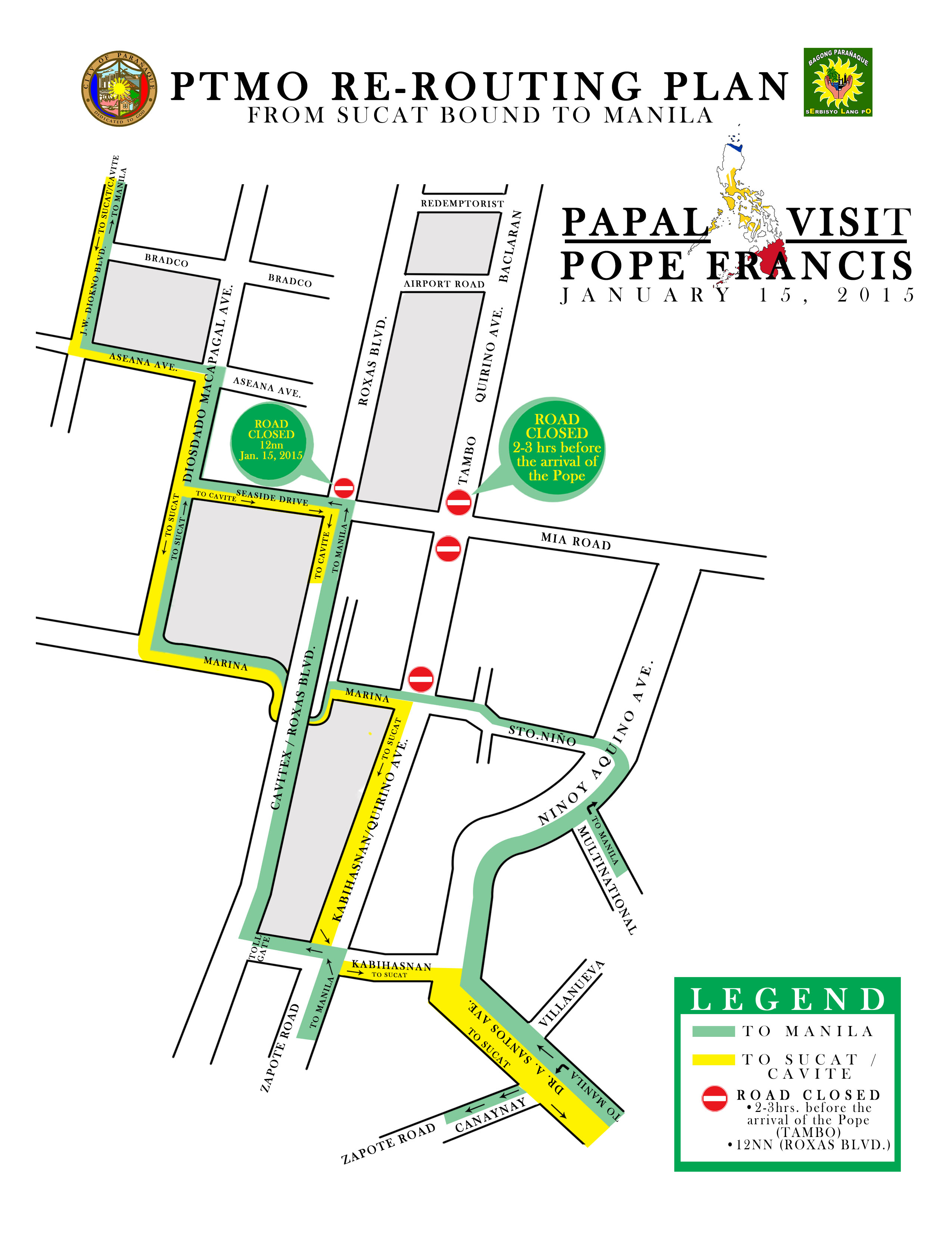 Paranaque Traffic Office releases re-routing plan for Papal visit by AlabangBulletin · January 14, 2015 Please be advised of the re-routing within Paranaque City in connection with the visit of Pope Francis: