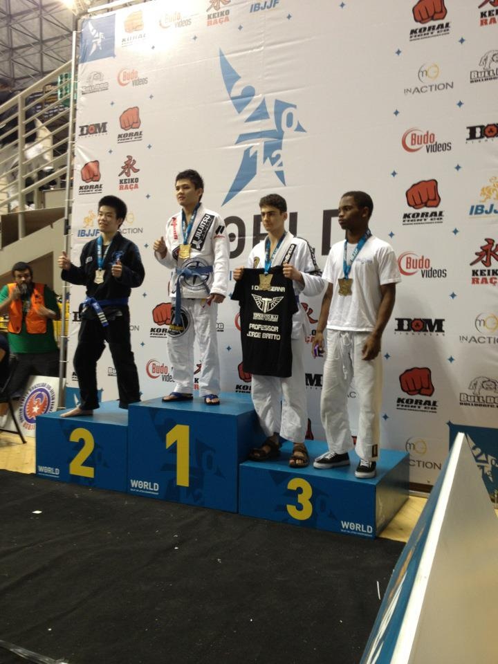 Parañaque Jiu-jitsuka fighter Eros Baluyot once again does the city proud by becoming the Champion in the 126 pounds Rooster Division at the World Jiu-jitsu Championship that was held last May 31, 2012 at Walter’s Pyramid in Long Beach, California U.S.A. Photo shows Eros (center) at the awarding ceremony of the said tournament.