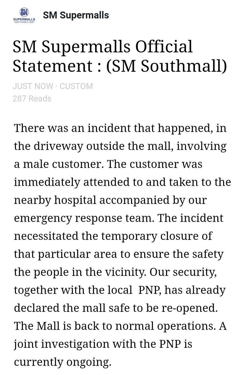 Please read the official statement of SM Southmall regarding the incident: