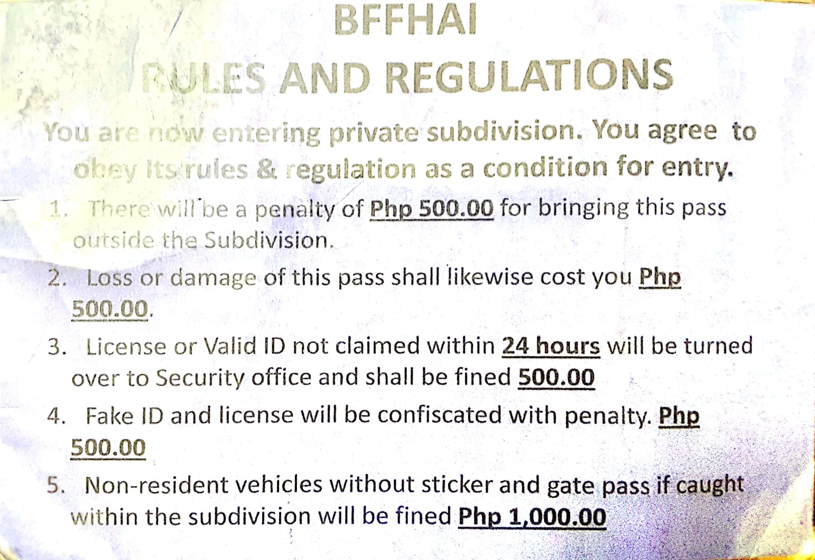 - There will be a penalty of P500 for bringing this pass outside the subdivision.