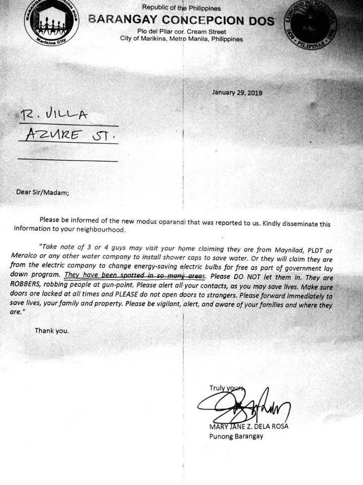 We also obtained a copy of a note from a barangay in Marikina warning its constituents about a similar incident.