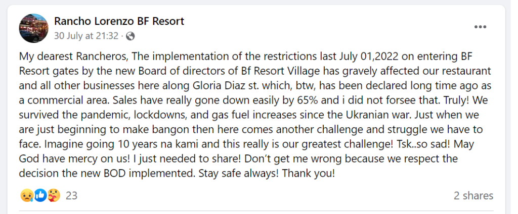 One of the business establishments inside BF Resort posting about their struggle on Facebook.