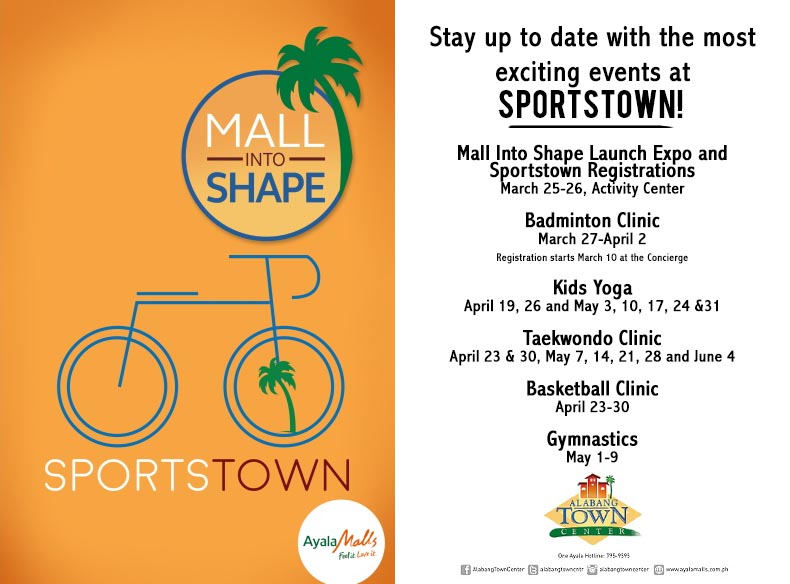 Sign up for these sports activities in Alabang Town Center now! by AlabangBulletin · Published March 10, 2017 · Updated March 10, 2017 Sportstown registration is during the Mall Into Shape Expo on March 25-26 at the Activity Center except for Badminton, in which registration has already begun at the Concierge.