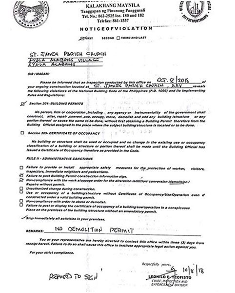 Apart from its existing violations, there is also the Notice of Violation given to the St. James Parish Church when the latter was inspected by representatives of Muntinlupa City last October 8, 2018.